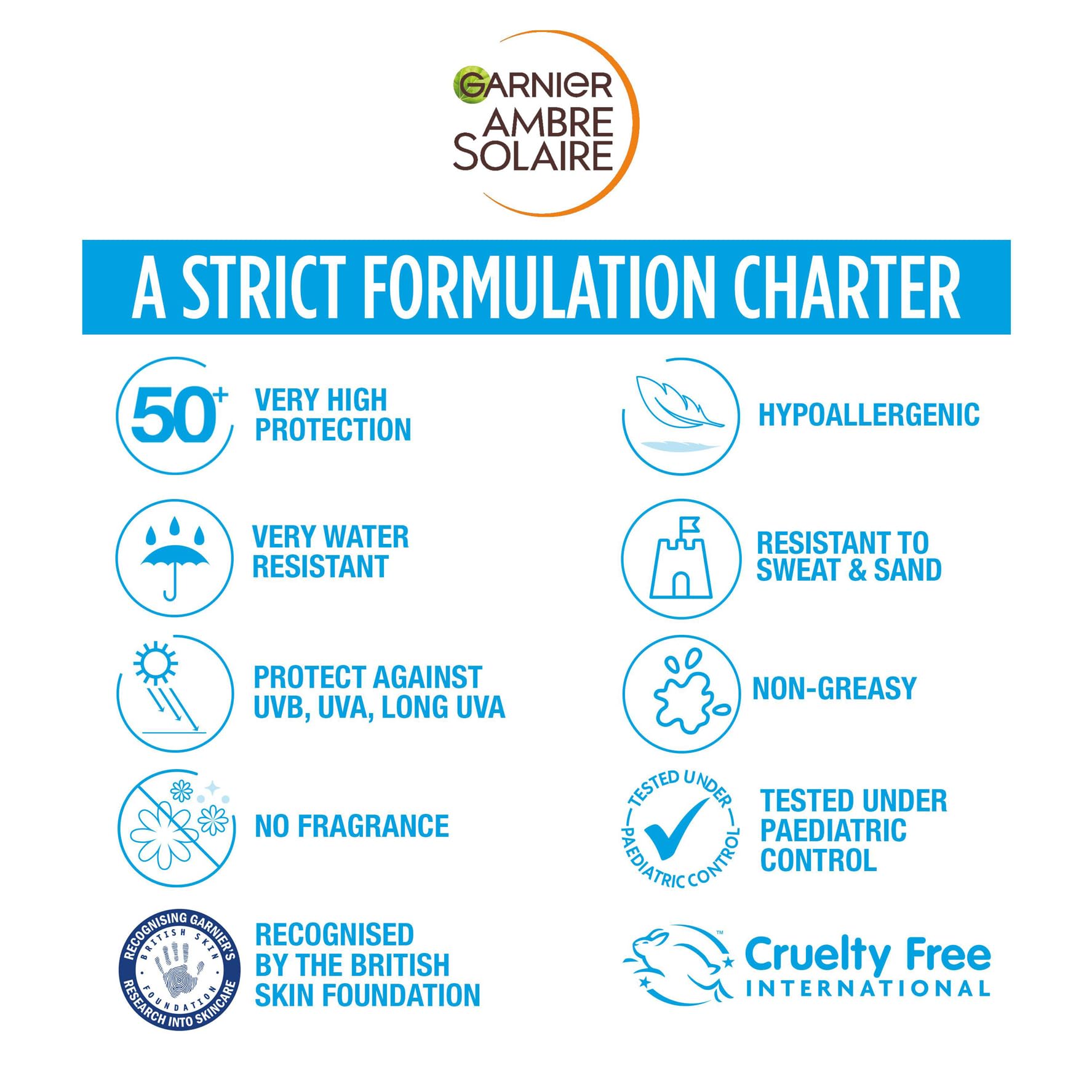 Garnier Ambre Solaire Kids Sensitive Advanced Anti-Sand Spray SPF 50+ immediately protects your kids from both short and long-term sun-induced damage. This very high protection sunscreen has a unique sand repelling action, so families everywhere can say no to that itchy sand feeling on skin! The fragrance-free lotion is especially developed for kids’ sensitive skin and is hypoallergenic, to minimise allergy risk. With Ceramide, providing UVA & UVB protection and instant skin barrier function protection.The formula is non-greasy and fast-absorbing, is very water resistant and resistant to sand & sweat. The spray format allows you to protect your kids’ skin from the sun quickly and easily. It can be used on body and face. The photostable formula has been tested under paediatric control and conforms 100% to European recommendations for protection against the harmful effects of UVA and UVB rays. Always keep babies and young children out of direct sunlight and protect your kids with a hat, t-shirt, and sunglasses as well as sun cream. Garnier suncare research is recognised by the British Skin Foundation.Ingredients885950 2 - INGREDIENTS: BUTANE, AQUA / WATER, ISOPROPYL MYRISTATE, DIISOPROPYL SEBACATE, ETHYLHEXYL SALICYLATE, BIS-ETHYLHEXYLOXYPHENOL METHOXYPHENYL TRIAZINE, BUTYL METHOXYDIBENZOYLMETHANE, C12-15 ALKYL BENZOATE, DROMETRIZOLE TRISILOXANE, DICAPRYLYL CARBONATE, STYRENE/ACRYLATES COPOLYMER, DIMETHICONE, PROPANEDIOL, DIISOPROPYL ADIPATE, PEG-30 DIPOLYHYDROXYSTEARATE, NYLON-12, METHYL METHACRYLATE CROSSPOLYMER, POLYMETHYLSILSESQUIOXANE, P-ANISIC ACID, TOCOPHEROL, SODIUM CHLORIDE, HYDROXYACETOPHENONE, SODIUM DODECYLBENZENESULFONATE, SODIUM BENZOATE, PEG-8 LAURATE, PEG-20, ETHYLHEXYL TRIAZONE, TRISODIUM ETHYLENEDIAMINE DISUCCINATE, POLY C10-30 ALKYL ACRYLATE, ISODODECANE, ISOSTEARYL ALCOHOL, ALOE BARBADENSIS LEAF JUICE, PROPYLENE CARBONATE, CAPRYLYL GLYCOL, CERAMIDE NP, DISTEARDIMONIUM HECTORITE, CITRIC ACID, POTASSIUM SORBATE, L AURYL PEG/PPG-18/18 METHICONE (F.I.L Z70014776/1).DirectionsSpray sunscreen directly onto skin, can be applied to body and face.Safety WarningFor external use only.