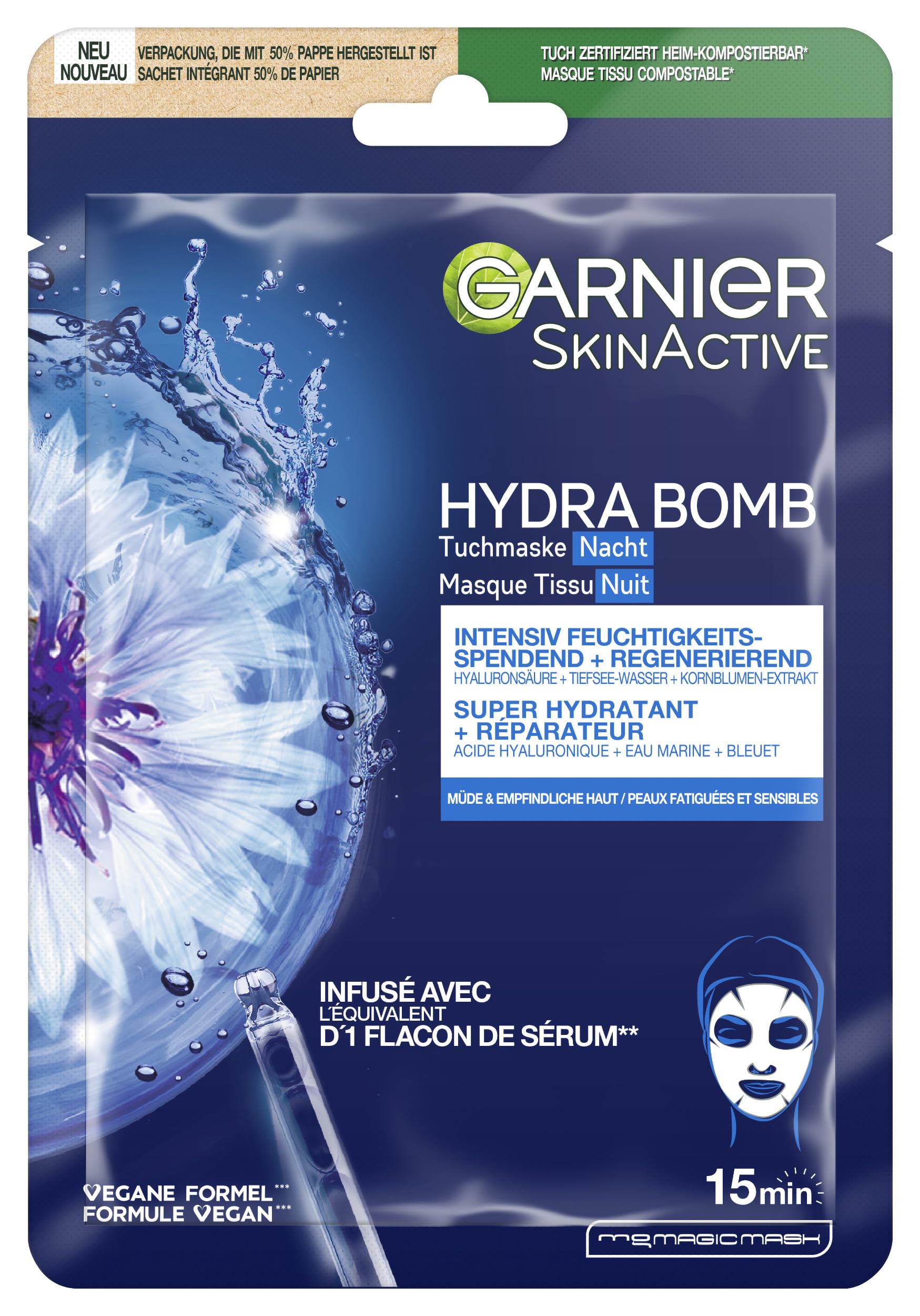 Product DescriptionTired, stressed and sensitive skin needs care that regenerates, especially at night. A face mask that hydrates, revitalises and lets the skin shine the next morning is optimal. The Garnier SkinActive Hydra Bomb night cloth mask was inspired by the beauty secrets of Asia. Hyaluronic acid moisturises the skin, deep sea water and cornflower extract have a revitalising effect. After 15 minutes of exposure time, the complexion looks brighter. The mask stimulates the regeneration process of the cells, so that the skin looks visibly radiant.Ingredients967456 55 - Ingredients: Aqua/Water • Propylene Glycol • Glycerine • Arginine • Centaurea Cyanus Flower Water • Citric Acid • Coconut Betaine • Dipotassium Glycyrhizate • GLYCYRHIZATE CERYL ACRY. Late/acrylic acid copolymer, hydrogenated strong hydrolysate, hydroxyacetophenone, hydroxyacetone, hydroxyethyl celllulose, lavandula hybrida oil, limonene, mannose, maris aqua/sea water, P-ana. ISIC ACID • PEG-40 HYDROGENATED CASTOR OIL • PHENOXYTHANOL • POTASSIUM HYDROXIDE • PROPANEDIOL • PVM/MA COPOLYMER • SODIUM HYALURONATE • XANTHAN GUM • Perfume / FRAGRANCE (F.I.L. C260527/1).