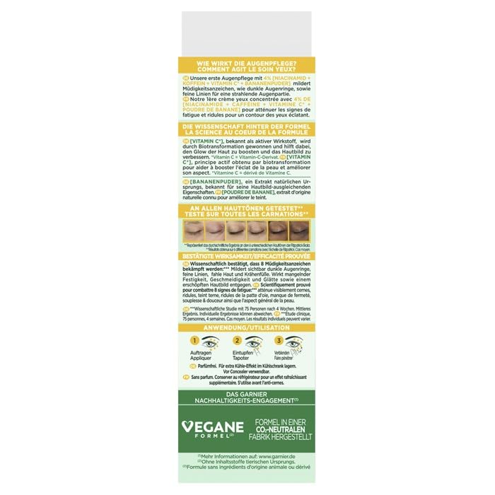 Product Description Introducing Garnier's Brightening Vitamin C Eye Cream, powered by green science and concentrated with 4% Vitamin C, Niacinamide, Caffeine & Banana Powder. Apply morning & evening to reduce signs of fatigue including appearance of dark circles and fine lines. For extra cooling effects store this eye cream in the refrigerator. Use along with Garnier Vitamin C Micellar Water, 3.5% Brightening Serum and Vitamin C Day cream for a complete brightening routine. The Science behind the Formula: Vitamin C (derivative of Vitamin C) known as a dermatological active, is obtained by biotransformation and helps to brighten skin and improve complexion. Banana Powder is a natural origin extract known to help improve skin tone over time. Proven Effectiveness: Tested on all skin tones, our eye cream is scientifically proven to reduce the appearance of 8 signs of fatigue**: dark circles, under eye fine lines, dullness, crow's feet, lack of firmness, smoothness, softness & overall skin appearance. In 1 week, get brighter, well-rested eyes. ** Cosmeto-clinical test, 75 people, after 4 weeks, medium case, individual result may vary. Fragrance free- store in fridge for extra cooling effects. Usable before concealer. Our eye cream has a vegan formula (no animal derived ingredients or by products) & Fragrance Free. All Garnier products globally are officially approved by Cruelty Free International under the Leaping Bunny programme, the leading organisation working to end animal testing, and the recognised Cruelty Free Gold Standard. The box and tube can be recycled and the cardboard is FSC certified. By using a FSC certified cardboard for this box, Garnier supports forest management that respects people and nature. Directions 1. Apply dots around eyes. 2. Tap with your fingers. 3. Blend while massaging. Directions: 1. Apply dots around eyes.2. Tap with your fingers.3. Blend while massaging.