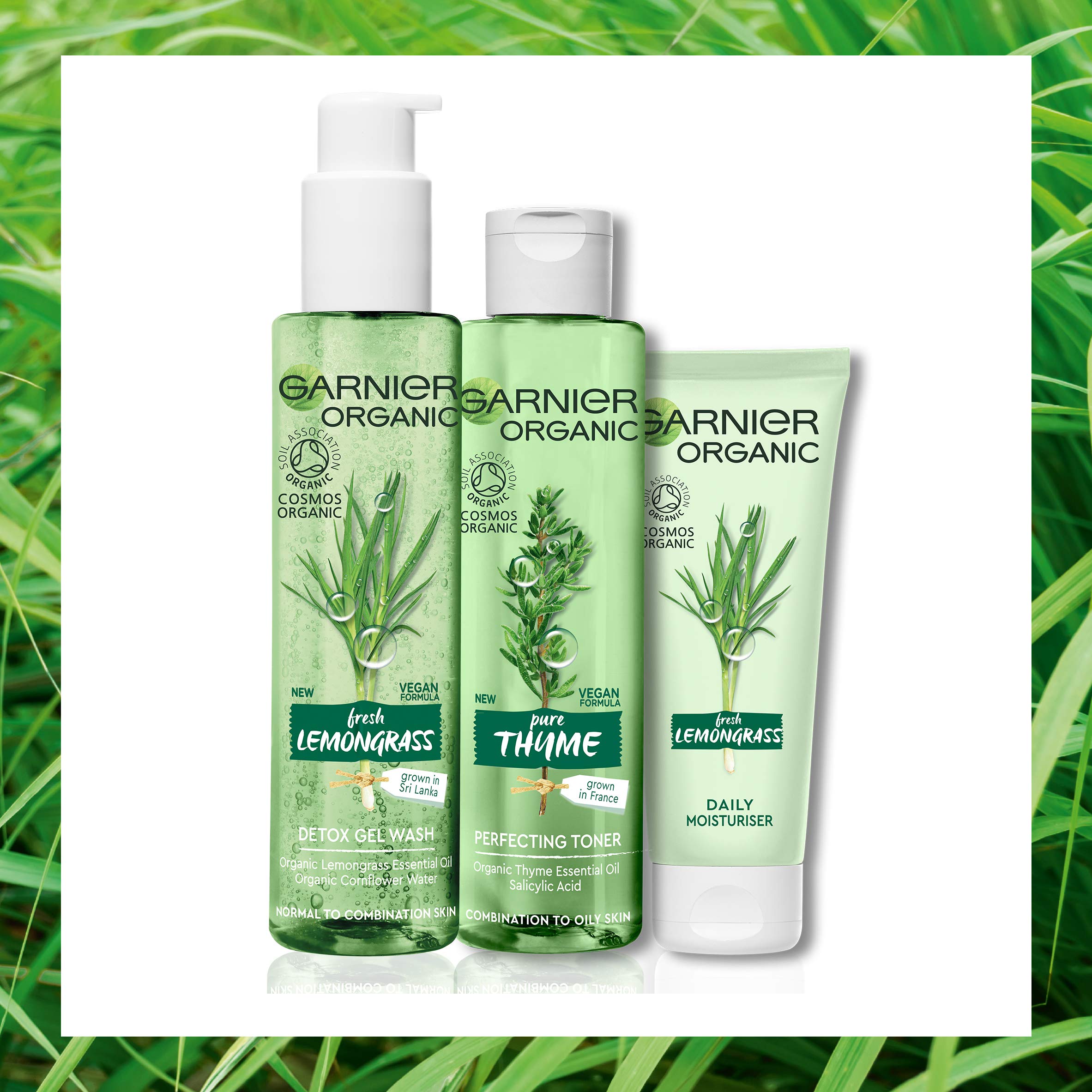 Our ultimate regime to refresh and purify skin, This 3 step kit leaves skin with a healthy glow all day long. Containing products from the new Garnier organic range, all products have vegan formulas* and are certified organic by the Soil Association. Our ultimate regime to refresh and purify skin, This 3 step kit leaves skin with a healthy glow all day long. Containing products from the new Garnier organic range, all products have vegan formulas* and are certified organic by the Soil Association. First use the detoxifying Lemongrass gel Wash to cleanse the skin. Enriched with organic Lemongrass essential oil, The gel cleanses away dirt, oil and pollution residues without drying skin out. Next apply the perfecting thyme toner using a cotton pad to purify and mattify skin. The toner is formulated with organic barley water and salicylic acid, which is effective on imperfections to make pores appear tightened and skin's texture appear refined. Lastly, apply a small amount of the refreshing Lemongrass moisturiser in circular motions to hydrate and refresh skin all day. *Vegan formula: No animal derived ingredients or by-products inside.IngredientsGarnier Organic Lemongrass Gel Wash 150ml 967384 12 Aqua / Water, Sucrose, Coco-Betaine, Glycerin, Coco-Glucoside, Disodium Cocoyl Glutamate, Xanthan Gum, Cymbopogon Schoenanthus Oil, Centaurea Cyanus Flower Water, Sodium Chloride, Sodium Cocoyl Glutamate, Arginine, Propanediol, Citric Acid, Sodium Benzoate, Salicylic Acid, Linalool, Eugenol, Limonene, Citral, Parfum / Fragrance (F.I.L B228369/1) Garnier Organic Thyme Toner 150ml 967394 26 Aqua / Water, Alcohol Denat, Hordeum Vulgare Stem Water, Thymus Vulgaris Flower/Leaf Oil - Thyme Flower/Leaf Oil, Centaurea Cyanus Flower Water, Arginine, Coco-Betaine, Propanediol, Caprylyl/Capryl Glucoside, Citric Acid, Menthol, Sodium Benzoate, Salicylic Acid, Linalool, Limonene, Parfum / Fragrance (F.I.L B227351/1) Garnier Organic Lemongrass Moisturiser 50ml 967396 22 Hordeum Vulgare, Stem Water, Aqua / Water, Dicaprylyl Carbonate, Glycerin Coco-Caprylate/Caprate, Alcohol Denat., Acacia Senegal Gum, Zea Mays Starch / Corn Starch, Cymbopogon, Schoenanthus Oil, Aloe Barbadensis Leaf Juice Powder, Centaurea Cyanus Flower Water, Arginine, Helianthus Annuus Seed Oil / Sunflower Seed Oil, Coco-Betaine, Propanediol, Carrageenan, Citric Acid, Xanthan Gum, Tocopherol, Sodium Benzoate, Salicylic Acid, Linalool, Geraniol, Eugenol, Limonene, Citral, Benzyl Alcohol, Parfum / Fragrance (F.I.L B223539/1)DirectionsFirst use the detoxifying Lemongrass Gel Wash to cleanse the skin. Next apply the Perfecting Thyme Toner using a cotton pad to purify and mattify skin. Lastly, apply a small amount of the refreshing Lemongrass moisturiser in circular motions to hydrate and refresh skin all day.Safety Warningsytay away from eye contact