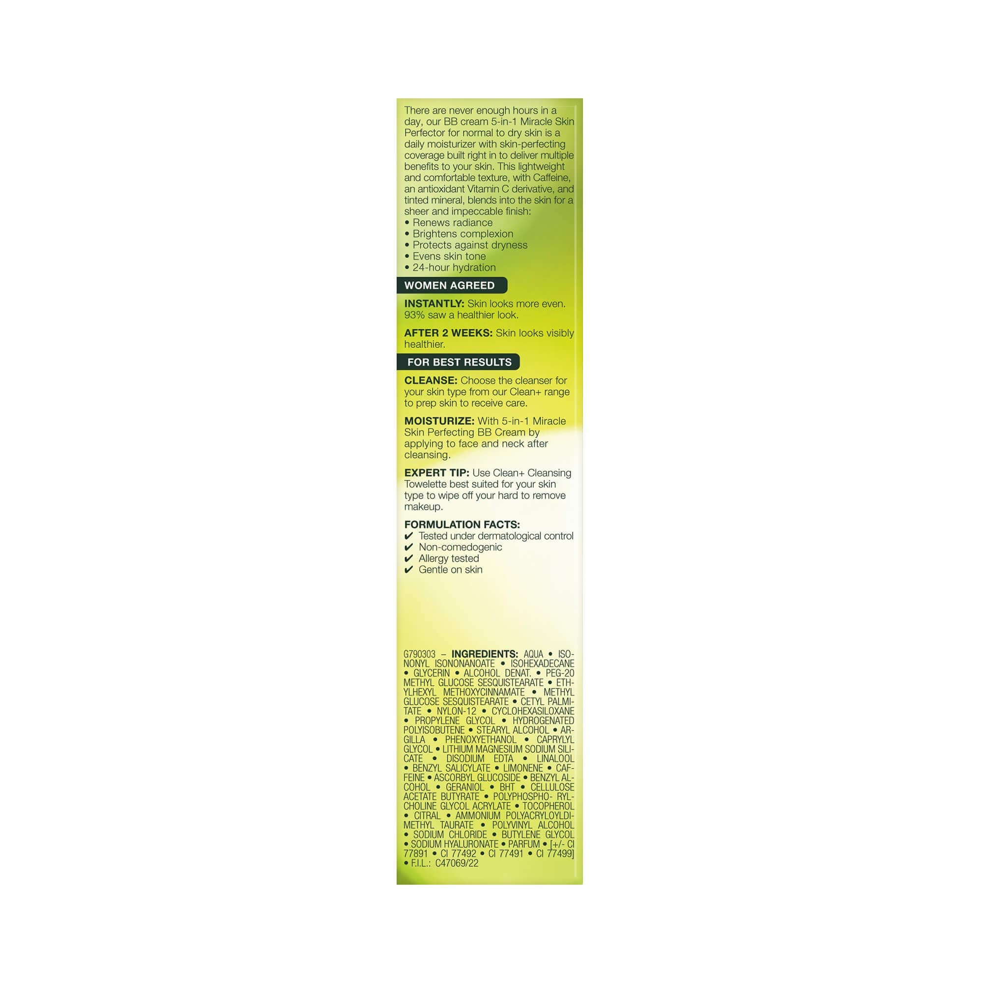 Save time with just one multi-benefit product that offers advanced skincare and immediate skin perfecting coverage. This hybrid formula renews radiance, brightens complexion, evens skin tone, hydrates and protects with SPF 15 UVA and UVB sunscreen. Get results you can see and feel instantly.