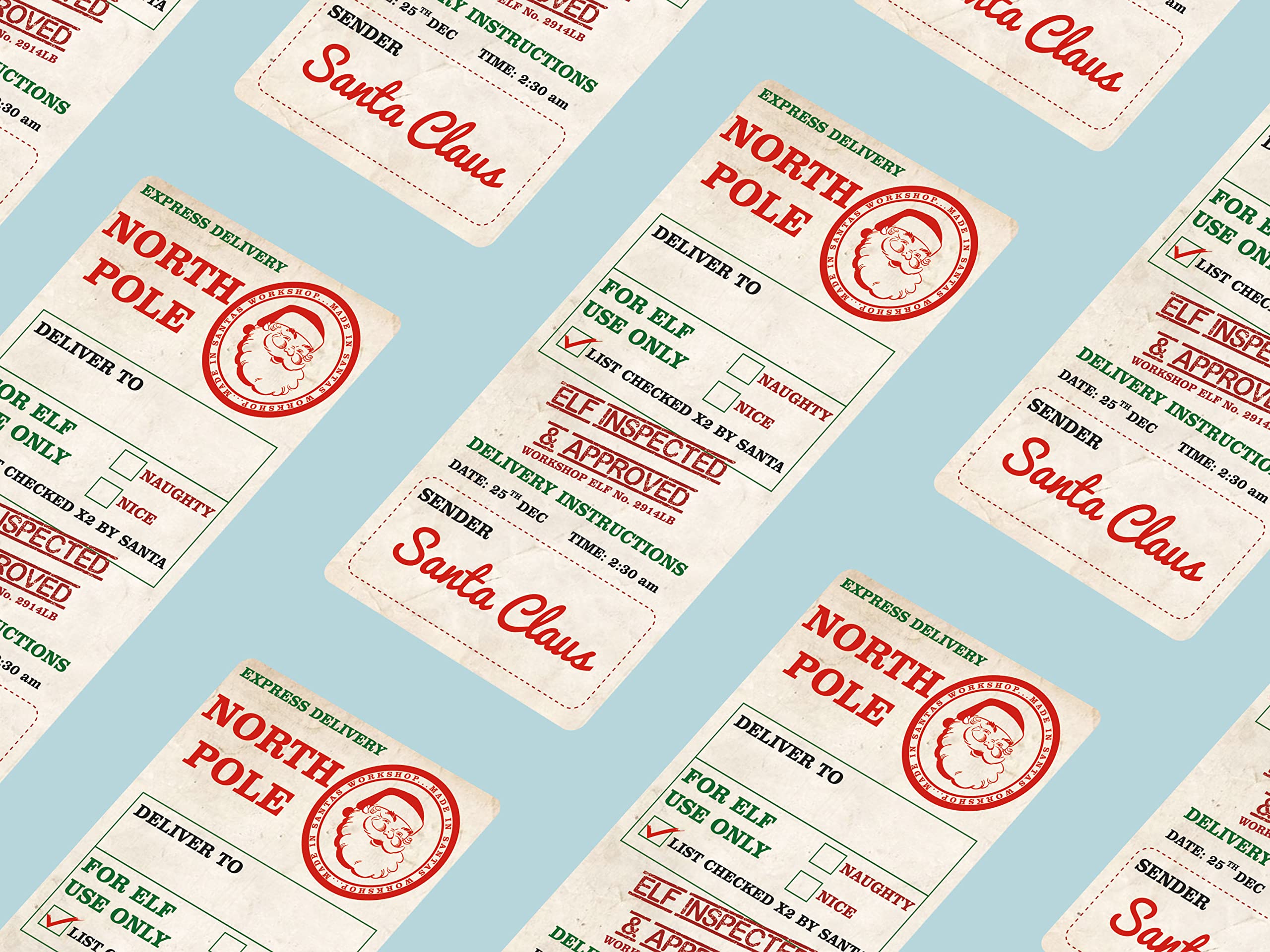 NORTH POLE Christmas Present Stickers - LARGE. Each order comprises of 30 stickers. Printed and contour cut on high quality matt vinyl. Easy to write on using biro, felt pen or similar. Simply Peel and Stick