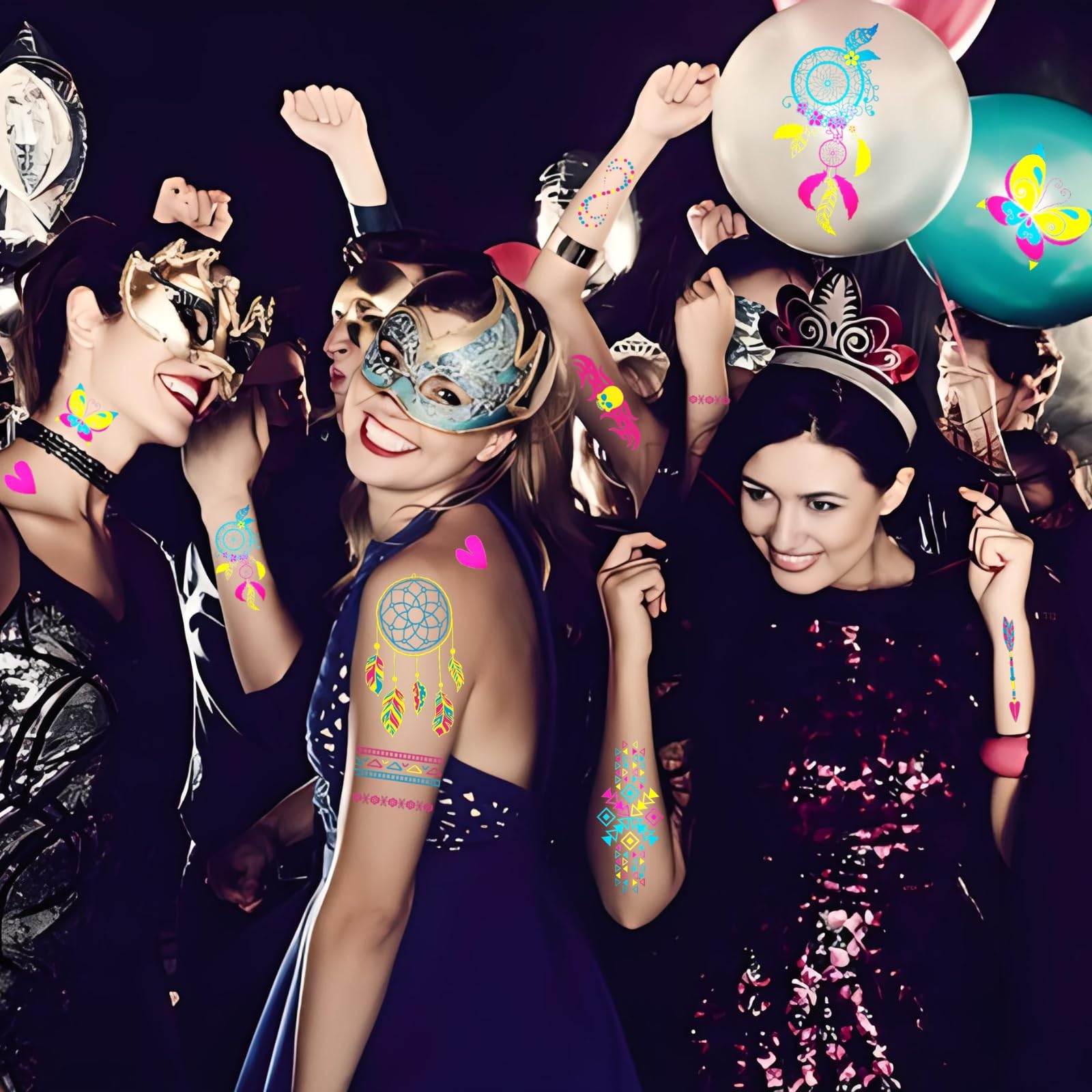 "Illuminate the night and express your unique style with our 20 Sheets of Glow UV Neon Temporary Tattoos. With over 160 dazzling designs, these tattoos are sure to make you stand out at any event. Temporary tattoos are versatile and suitable for a myriad of occasions including Halloween makeup, gym sessions, parties, clubbing, carnivals, weddings, dancing, beach outings, festivals, vacations, concerts, poolside lounging, evening events, music festivals, and any place lit by UV lighting, these tattoos will add an extra element of fun and excitement. Our flash neon temporary tattoos are not only eye-catching but also long-lasting. They maintain their glittery allure for several days, ensuring you look fabulous throughout your adventures. Plus, they are waterproof, making them perfect for pool parties, beach days, or even a sweaty gym session. Applying these tattoos is a breeze-simply use water and in 10-20 seconds, you'll have a stunning new accessory. And when it's time for a change, removal is just as easy with rubbing alcohol, body oil, or olive oil. Forget about the hassle of face or body paint. Our stylish fake jewelry tattoos can be placed anywhere on your skin, from arms and wrists to fingers and ankles. They are safe and fun for all ages, women, men, boys, girls, so everyone can join in on the excitement. Backed by a money-back guarantee, your satisfaction is our priority. So why wait? Add some glow to your life and let your personality shine with our UV neon temporary tattoos. Application Instructions: 1. Select your desired tattoo and carefully cut it out, removing the clear sheet. 2. Place the tattoo face down onto clean, dry skin. 3. Thoroughly wet the tattoo with a sponge or cloth. 4. After 20-30 seconds, gently peel off the backing paper to reveal your tattoo. Removal Instructions: 1. Dab the tattoo with rubbing alcohol or baby oil. 2. After 10 seconds, gently rub the area with more rubbing alcohol or baby oil until the tattoo is completely removed. "