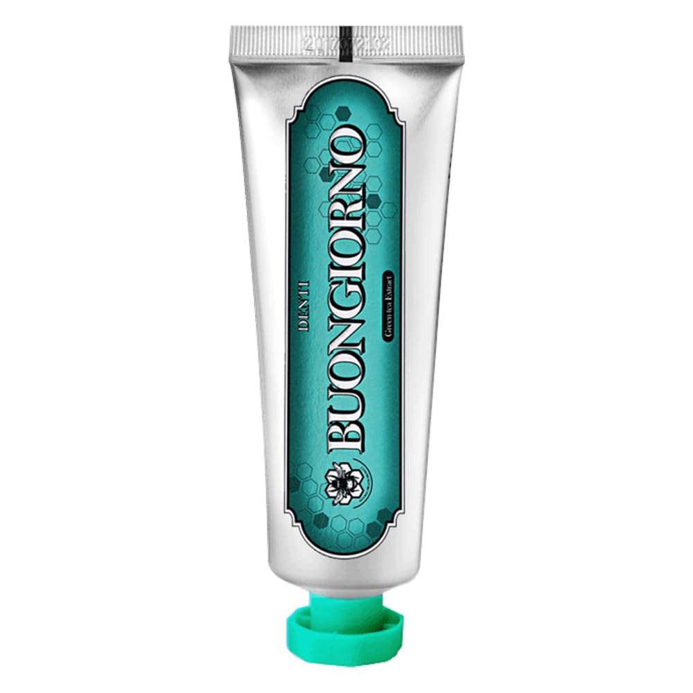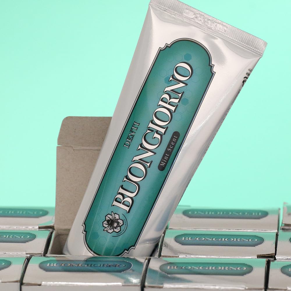 Atosafe Denti Buongiorno Toothpaste 3.52 oz. 100g Halitosis care mint toothpaste - One of popular Korean toothpastes: sold over 230 milion since 2018 in South Korea. - Halitosis Care: 72% and 89% decreased in respectively hydrogen sulfide and methyl mercaptan, according to a clinical test by Ellead Skin & Bio Research, 2023. - Antiplaque, Anticavity, halitosis care, fresh breath, and maintaining teeth clean. Containing 500 ppm of Fluorine. - 7 Helpful Organic Ingredients: Grean Tea Extract, Calendula Officinalis Flower Extract, Grapefruit Extract (USDA), Eucalyptus Extract, Aloe Vera Extract, Sage Extract, Camomile Extract, Calendula Officinalis Flower Extract (Ecocert) *Organic Certified for each ingredients, NOT for the toothpaste itself. - 22 Chemicals FREE: SLS, CMIT, MIT, Triclosan, Six kinds of Parabens, 4-Hydroxybenzoic Acid, Five heavy metals, BBP, DBP, Form Aldehyde, Dioxane, Methanol, and DEHP. Atosafe, established in 2001, has been supplying many household products such as laundry detergent, dishwashing detergent, hand wash, toothpaste, and coming up more. Denti Buongiorno Toothpaste is one of the popular toothpastes in South Korea, sold over 210 millions since 2018. Full ingredients: Silica Dioxide, Sodium Monofluorophosphate, Propolis Extract, D-Sorbitol, Glycerin, Polyethylene Glycol 1500, Sodium Carboxymethylcelluos, Grean Tea Extract, Calendula Officinalis Flower Extract, Grapefruit Extract, Eucalyptus Extract, Aloe Vera Extract, Sage Extract, Camomile Extract, Calendula Officinalis Flower Extract, Xylitol, Sodium Chloride, L-Menthol, Peppermint Oil, Mint flavor, Titanium Dioxide, Sodium Cocoyl Glutamate, Purified Water. Manufactured by Dongil Pharmaceutical Co., Ltd. 26 Linosandan-gil, Maengdong-myeon, Eumseong-gu, Chungbuk-si, South Korea. How to Use: apply proper amount of the toothpaste onto a soft brush. Brush teeth thoroughly at least twice a day or per a dentist's direction. *Children under 6 years of age. 1/3 inch-size amount of the toothpaste is recommended for each brushing. Please parents make sure the children use it as guided. (e.g. keep children from swallowing it.) Cautions. 1. Do NOT swallow. 2. Rinse the mouth enough after brushing. 3. Keep out of reach of shildren. 4. If children under 6 years of age swallowed it more than as guided, get medical help immediately. 5. Stop use and ask a dentist if you feel sensitivity or pain in teeth or gum.