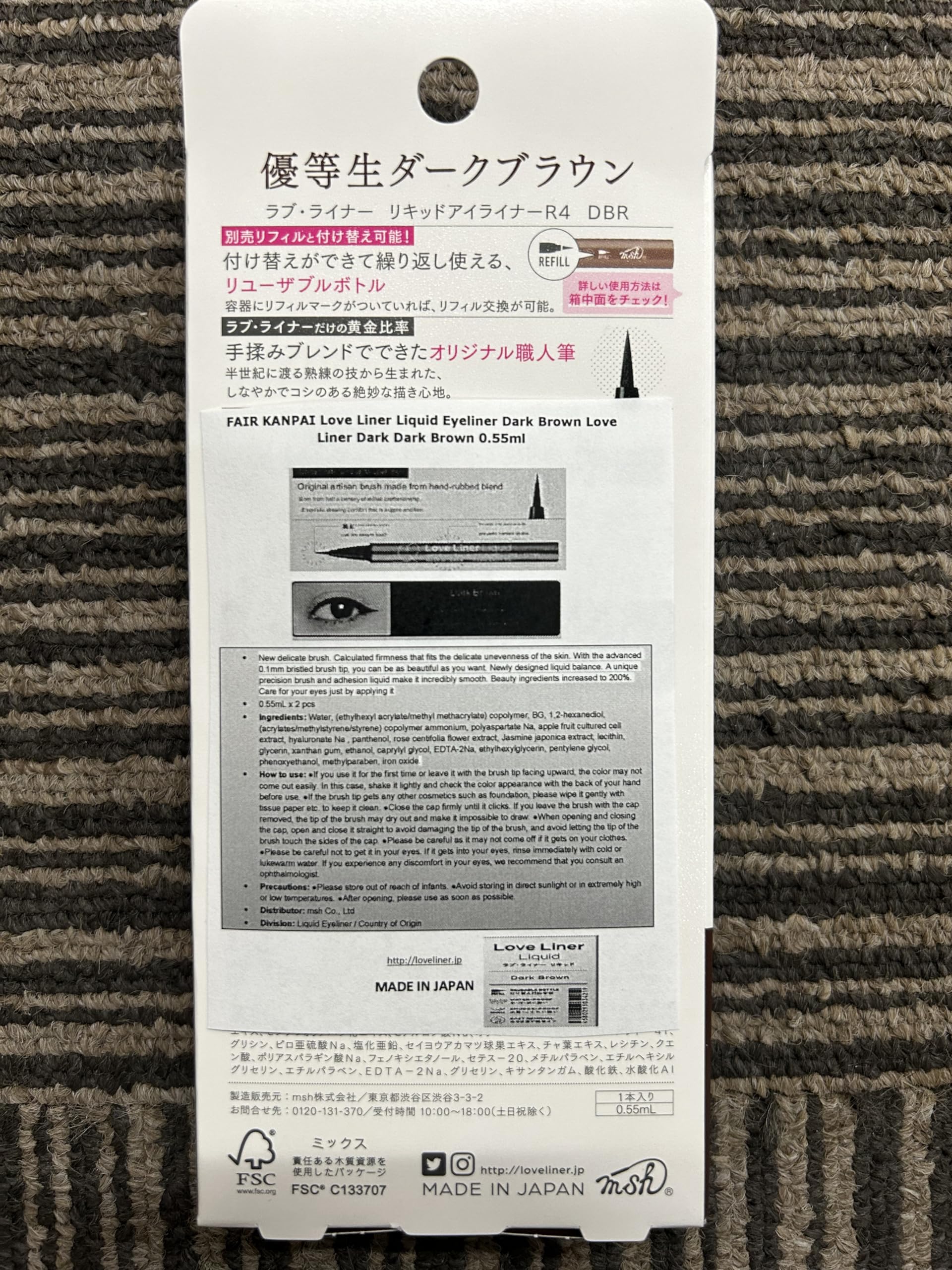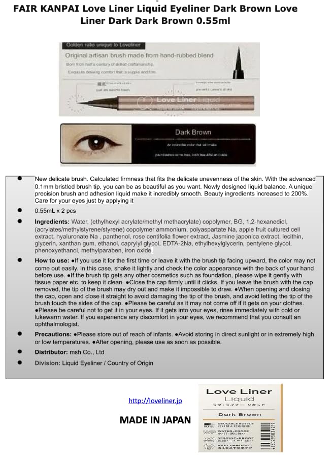 "Kawaii changes the future. The packaging has been greatly renewed to materials that are made with environmental protection as it has been used to minimize the use of plastic. The new "reusable bottle" has been replaced and reusable. Love the planet with eyeliner that protects resources and reduces waste. The perfect balance between the softness of the eyelid and the smoothness that is best suited for your eyelid to achieve the best painting experience ever in love liner. In addition to the 5 different beauty ingredients used in conventional products, this product is a new blend of beauty ingredients that will fulfill your eyelash care. We have added 2 new colors to keep you updated and fashionable in all 6 colors. Black... Dark black with good color to make your eyes stand out. Dark Brown... Invincible colors that will make you look beautiful and cute. Brown... Redish brown that highlights the natural glamour. Milk Brown... The color of milk tea feels good on your skin and gives it a nuddy impression. Mocha Greige... a nuanced color with a sense of transparency. Roze Brown... Brown with a bit of pink for a cute look. Volume: 0.55 ml