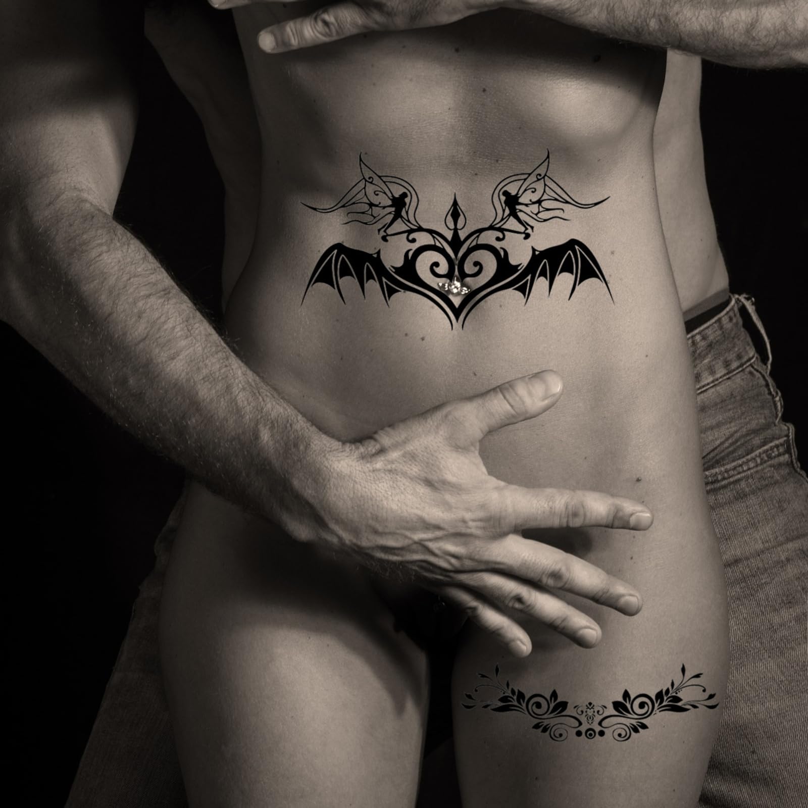 This product is a collection of temporary tattoos designed for women, particularly for adding a sexy and playful touch to their appearance. The set includes a variety of designs, such as lace patterns, abdomen and waist tattoos, and succubus-themed tattoos. With large lace abdomen and waist waterproof tattoo stickers, as well as sexy temporary tattoos stickers specifically designed for the abdomen and waist, this collection offers a wide range of options for enhancing one's look. These tattoos are ideal for various occasions, including bachelorette parties and cosplay events. The succubus-themed tattoos add a playful and flirtatious element, perfect for women's anime role play costumes or sexy cosplay outfits. Overall, these temporary tattoos provide an easy and temporary way for women to express their sensuality and style, whether it's for a special event or just for fun.
