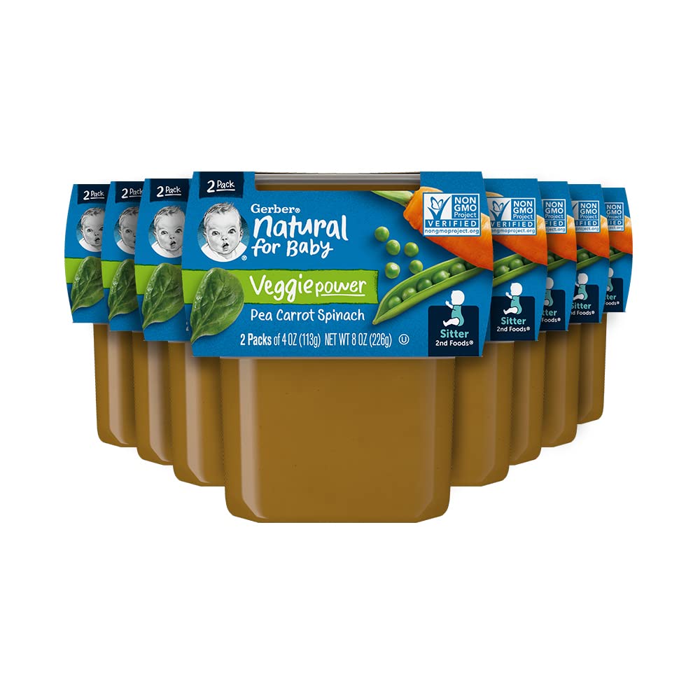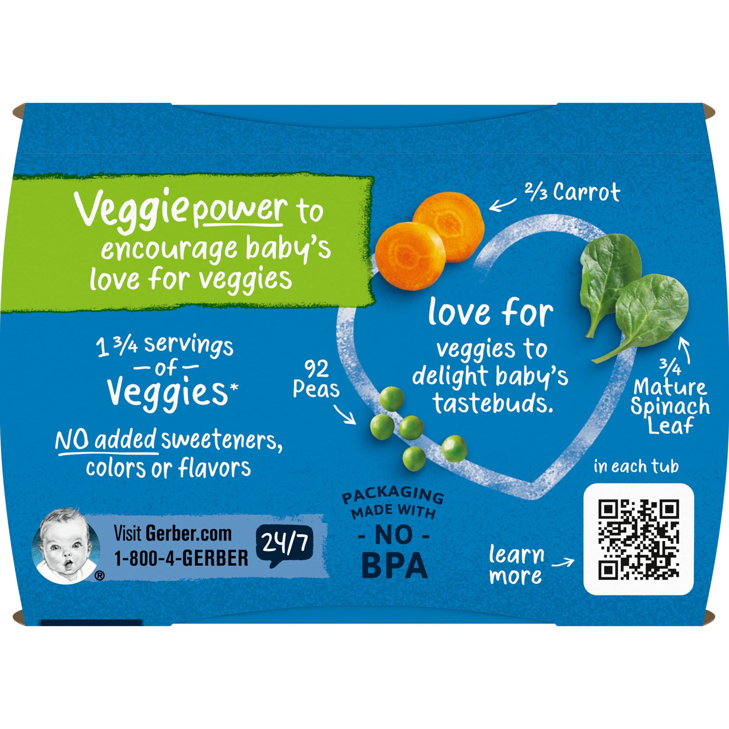 Continue your baby’s love of veggies with Gerber 2nd Foods Pea Carrot Spinach baby food. Gerber 2nd Foods baby food helps expose babies to a variety of tastes and ingredient combinations which is important to help them accept new flavors. All our recipes are made with fruits and veggies that meet Gerber’s high quality standards. This recipe includes a lot of love, care, 92 peas, 2/3 carrot and 3/4 spinach leaf in each tub.