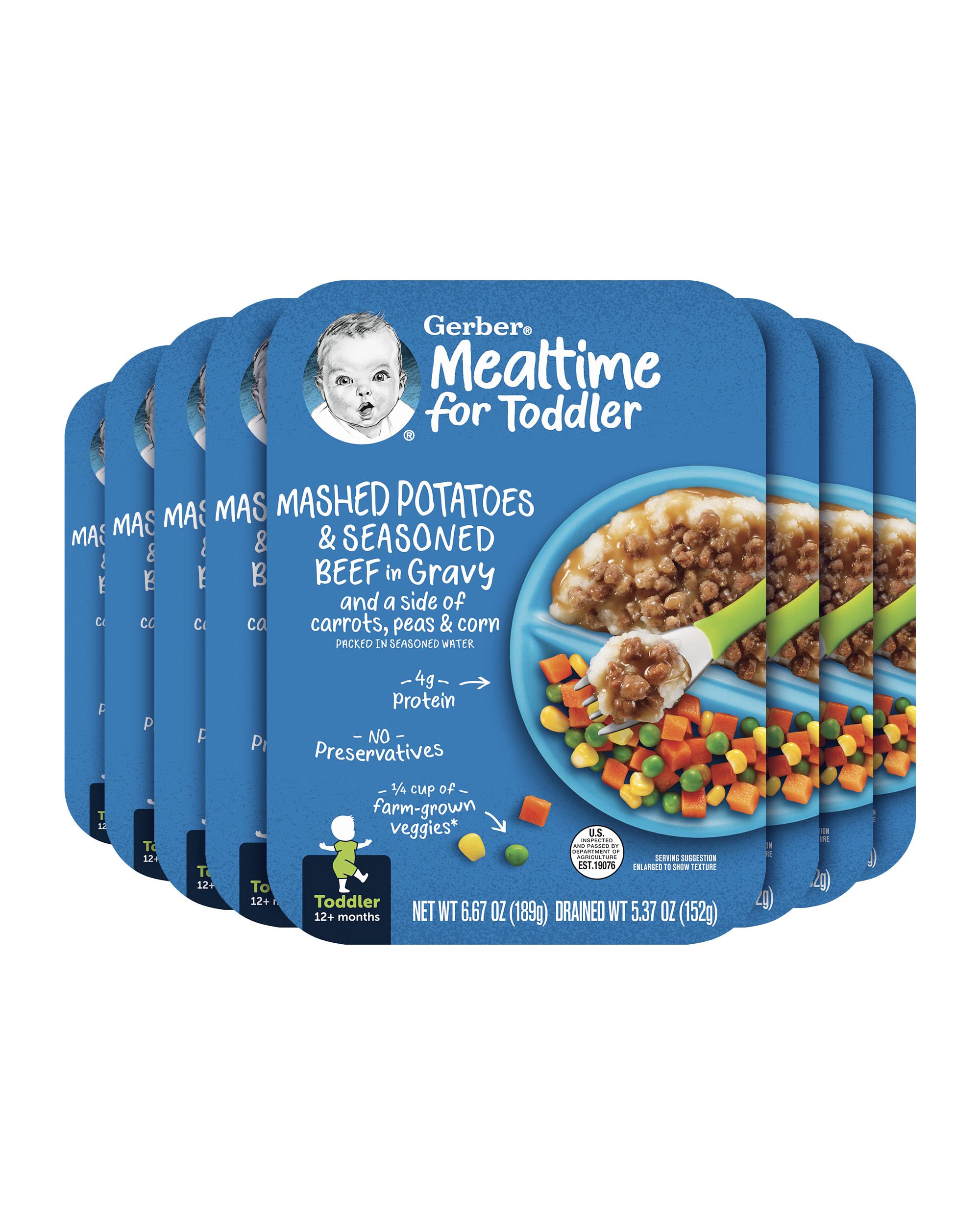 DescriptionYour toddler will enjoy Gerber’s Mashed Potatoes & Seasoned Beef in Gravy with a side of carrots, peas and corn. First, we combine our ingredients and seal them up tight. Then we slowly cook for just the right amount of time. No preservatives needed. This entree consists of farm grown veggies with bite sized carrots, corn and peas totaling ¼ cup veggies, as calculated using the USDA Food Buying Guide for Child Nutrition Programs. This entree contains the nutrients toddlers need for healthy growth like 4g of protein, which is 19% of the daily value of protein.