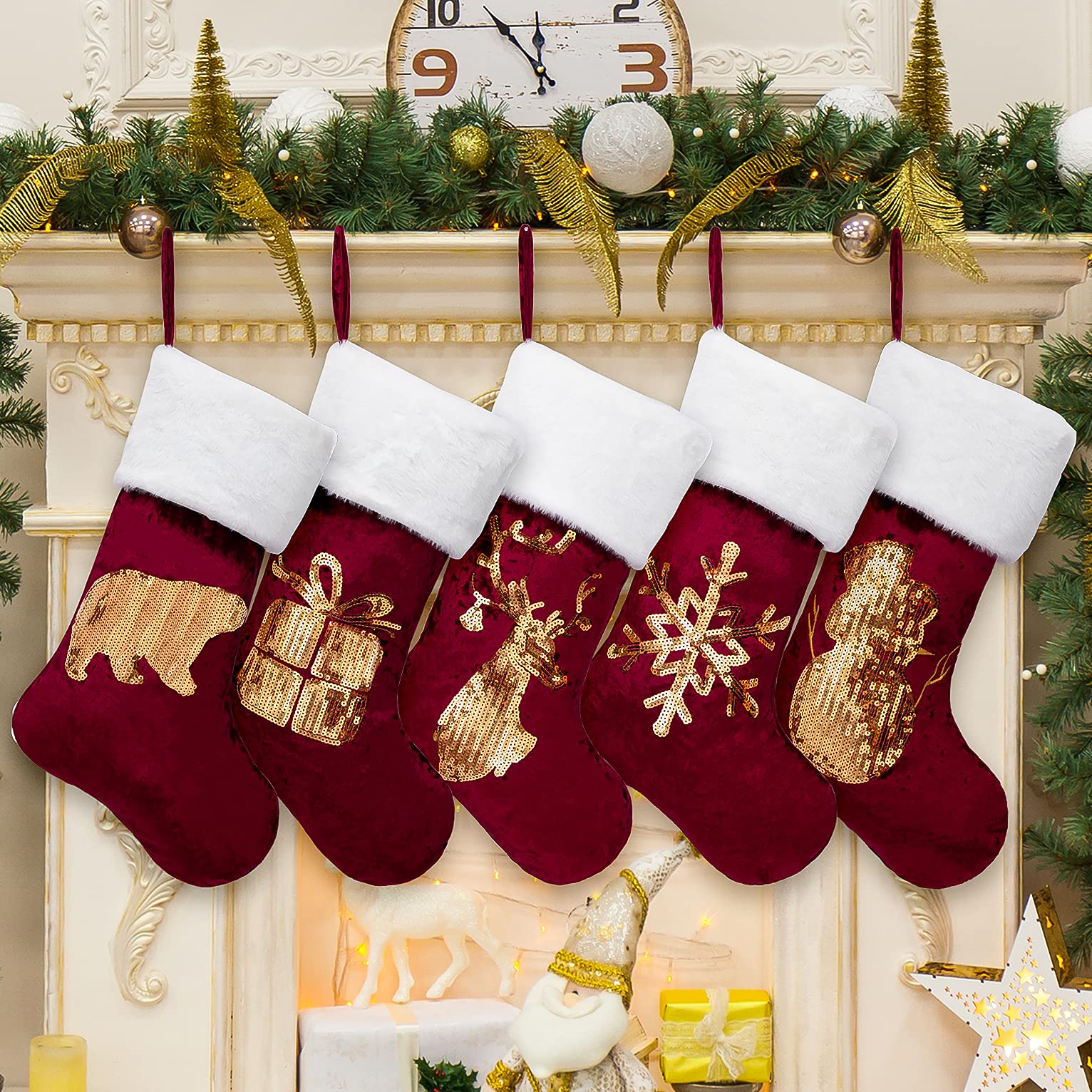 GEX 2021 Christmas Stockings 5 Pack for Family 20" Sequins Embroidery Classic Velvet with Faux Fur Fireplace Tree Large Decorations Hanging Ornament for Xmas Holiday Party Season Decor (Set of 5)