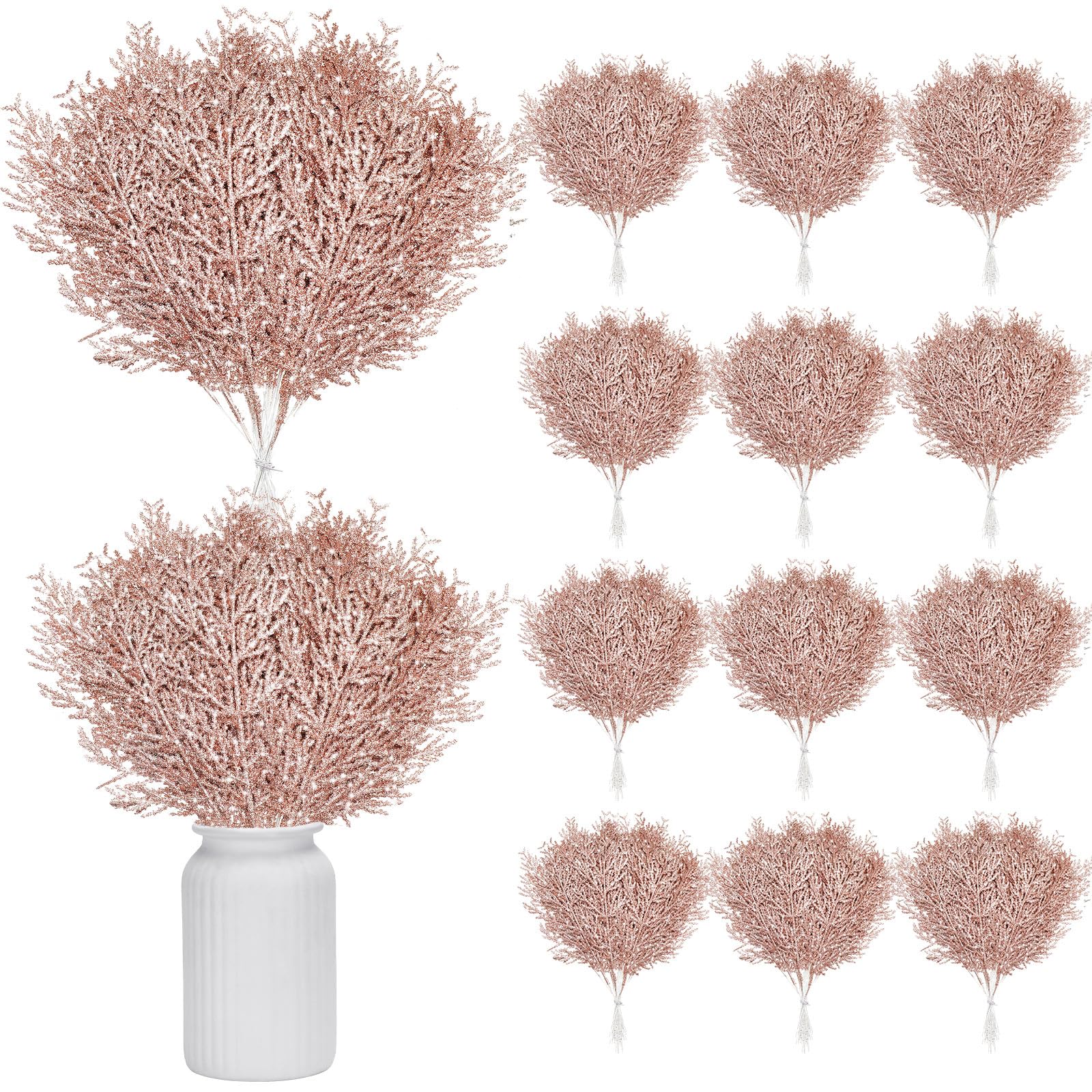 Giegxin 48 Pcs Christmas Glitter Artificial Pine Needles Pine Tree Twig Picks Branches for Christmas Tree Glittery Stem for Christmas DIY Wreath Garden Embellishing Garland Decoration (Rose Gold)