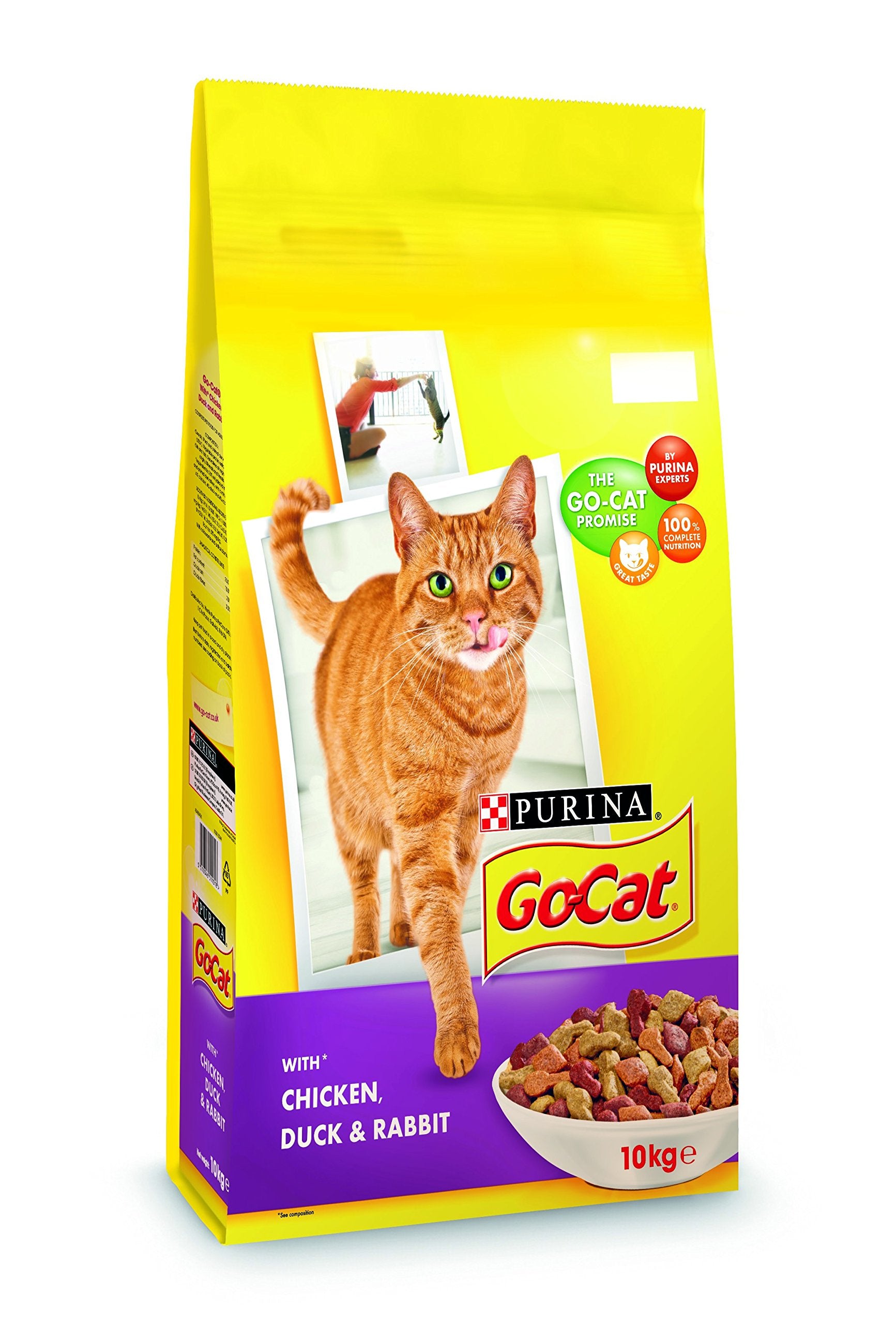 Product DescriptionGo-Cat Dry Cat Adult Food Chicken and Duck Dry Cat Food, 10 kg.IngredientsCereals(20%)Meat and Animal Derivatives (4% Rabbit and 4% Chicken in Dark Red and Light Brown Kibbles, 4% Duck in Red Kibbles)Vegetable Protein ExtractsOils and FatsDerivatives of Vegetable OriginYeasts MineralsAdditives: Nutritional AdditivesIU/kg: Vit A: 12 500 ; Vit D3: 1 000; mg/kg: Fe(E1): 145; I(E2): 2.5: Cu(E4): 35; Mn(E5): 16; Zn(E6): 183; Se(E8): 0.25. Taurine: 870. With colourants and antioxidants.Analytical ConstituentsProtein: 30.0%Fat content: 10.0%Crude ash: 7.5%Crude fibres: 2.5%DirectionsDaily Feeding GuideWeight of animal 3 kg, Food quantity 55 gWeight of animal 4 kg, Food quantity 70 gWeight of animal 5 kg, Food quantity 90 gThe adult maintenance averages are based on moderately active cats at normal environmental temperatures. Individual needs vary and feeding should be adjusted as required to maintain your cat at a lean, healthy body weight. Fresh, clean water should always be available.Legal DisclaimerUnless expressly indicated otherwise, Amazon.co.uk is not the manufacturer of the products sold on this site. Actual product packaging and materials may contain more and different information than what is shown on our website. We recommend that you do not rely solely on the information presented on our website. Please always read labels, warnings, and directions provided with the product before using or consuming the product. Please see our full disclaimer below.Box ContainsEach order comes with 1 x 10kg Go-Cat Duck, Rabbit and ChickenManufacturer Contact InformationUnited Kingdom: 0800 212 161 Republic of Ireland: 1800 509 368 9am to 5pm, Monday to Friday