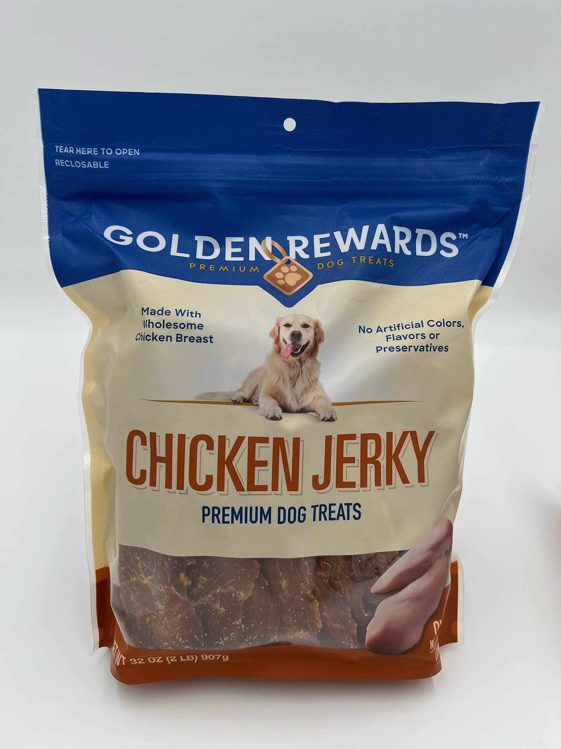Golden Rewards Jerky Recipe Dog Treats, Chicken, 32 oz. Made with real wholesome chicken breast and paired with vegetable glycerin and salt which amplifies their meaty flavor, making them the perfect snack or treat to give your canine companion for being the best dog they can be. With no added chicken by-products, wheat, soy, corn, artificial colors, or flavors, you can be sure your dog is getting a healthy snack that is rich in animal protein and low in fat.