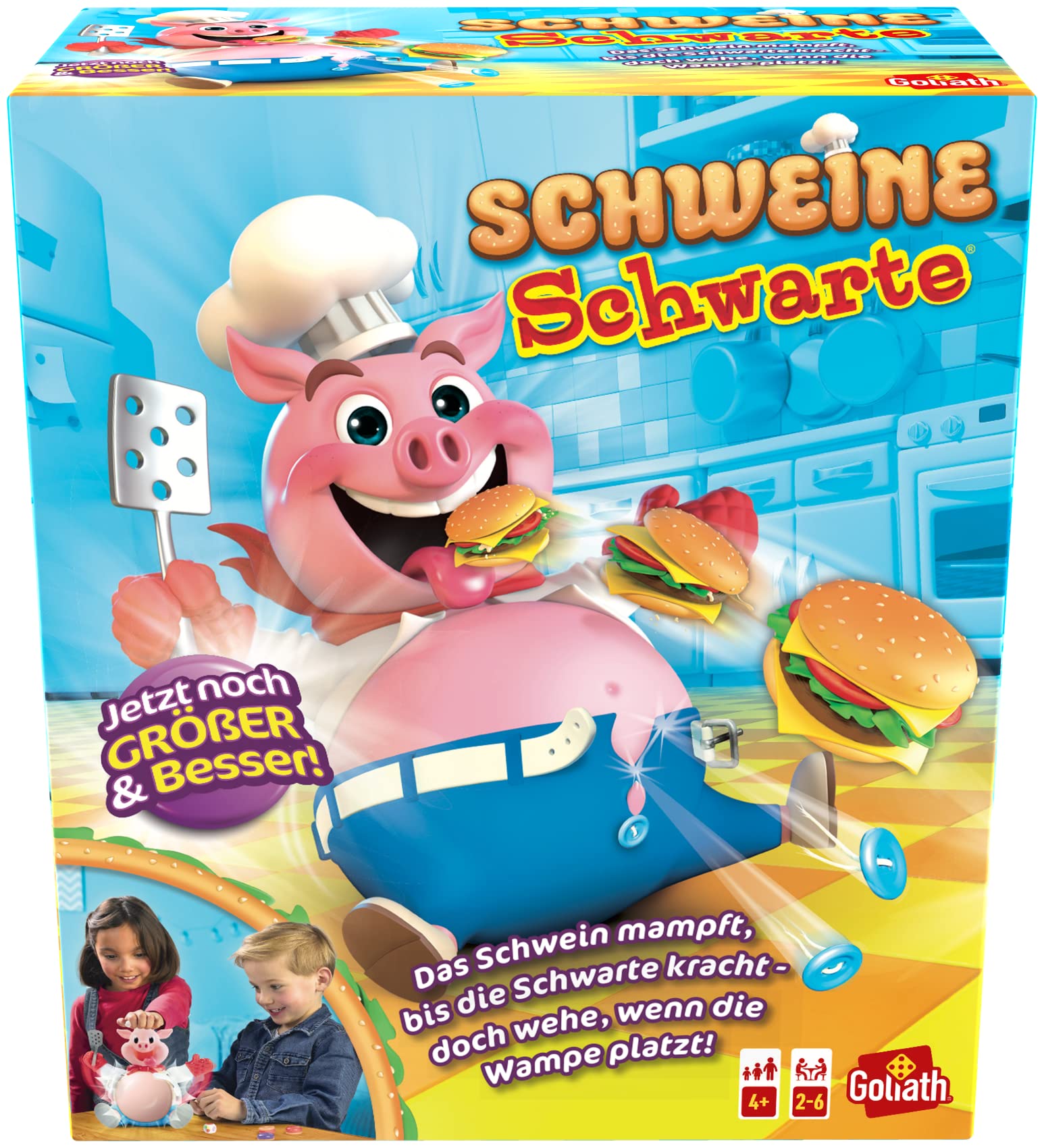 Product DescriptionPop the Pig is an international classic that is adored by literally millions of children. Redesigned in 2013 to make it easier for kids ages 3-6 to play, children can quickly reset the game with one pump of the pig’s head and experience consistent belly busting game-play each and every time. Pop the Pig provides hours of fun constructive enjoyment and is completely kid powered! For added convenience, all pieces can be stored inside the pig. Everyone takes turns to roll the die to see how many chomps the pig will take. Push down the pig's head to chomp the burger. With every pump, the pig's stomach will get bigger, bigger, and bigger. But don't feed him too much because if he pops, you lose!.Set Contains:Action-game"Popthepig"