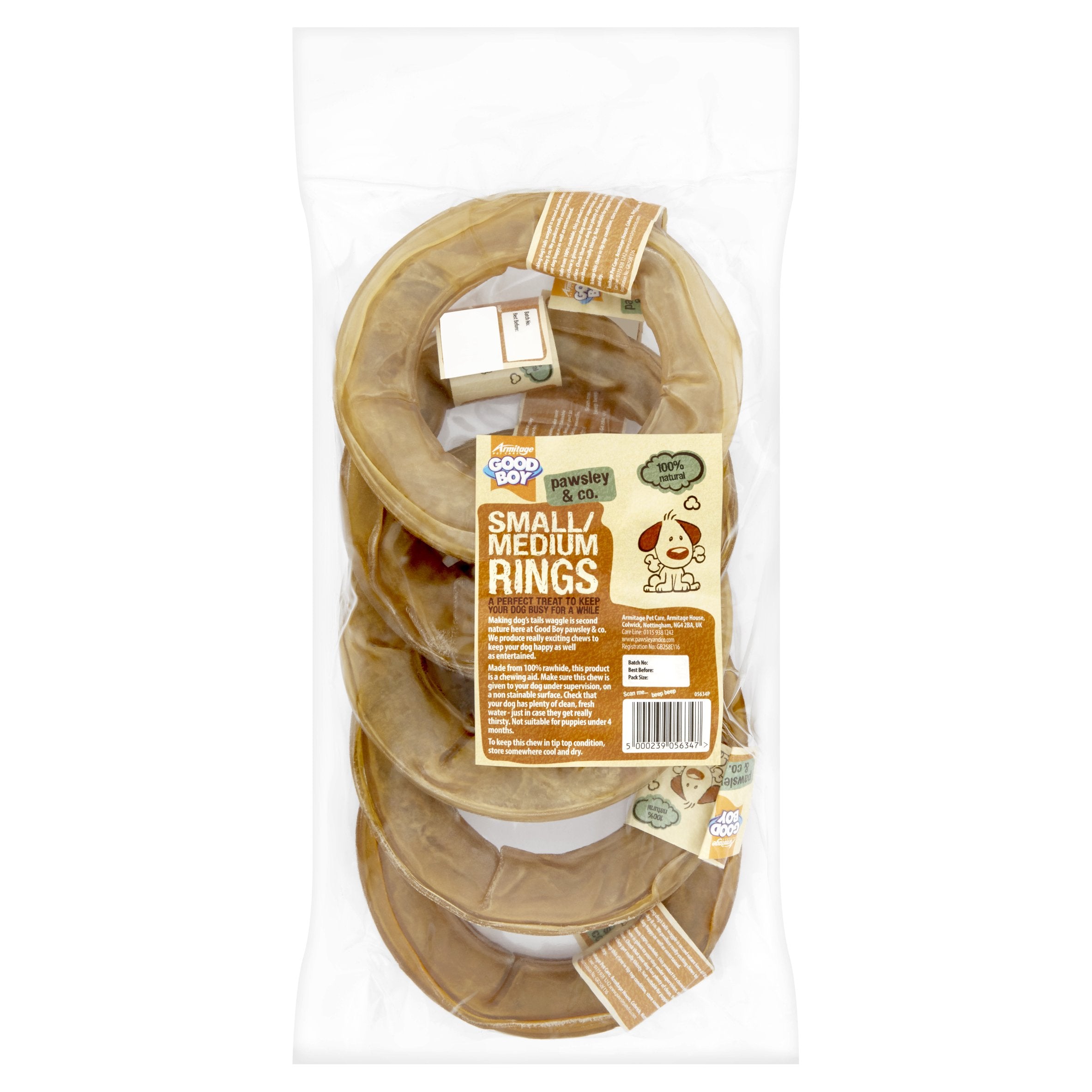 Product Description OUR ETHOS Here at Good Boy we're all about quality, buckets full of fun and most importantly super tasty treats for your doggies. We know how important it is to feed your furry pet the right dog treats for their size, age and breed. We also know how important treats are for making your dog super happy. We have created a diverse range of dog treats in all different shapes, flavours and sizes to treat your dog on every occasion.WHY CHOOSE OUR SMALL/MEDIUM RAWHIDE RINGS Made from 100 Percent rawhide, these dog chews are a chewing aid and are sure to get your dogs' tail wagging. What's more, chewing can not only provide your dog with stimulation, but more importantly, it can help keep your dogs' jaw strong and teeth clean.THINGS YOU SHOULD KNOW Make sure this chew is given to your dog under supervision, on a non-stainable surface. Check that your dog has plenty of clean, fresh water - just in case they get really thirsty. Not suitable for puppies under 4 months. To avoid potential choking hazard, ensure you choose a treat which is an appropriate size for the breed and age of your dog. Ingredients Ingredients: Composition: 100 Percent Rawhide