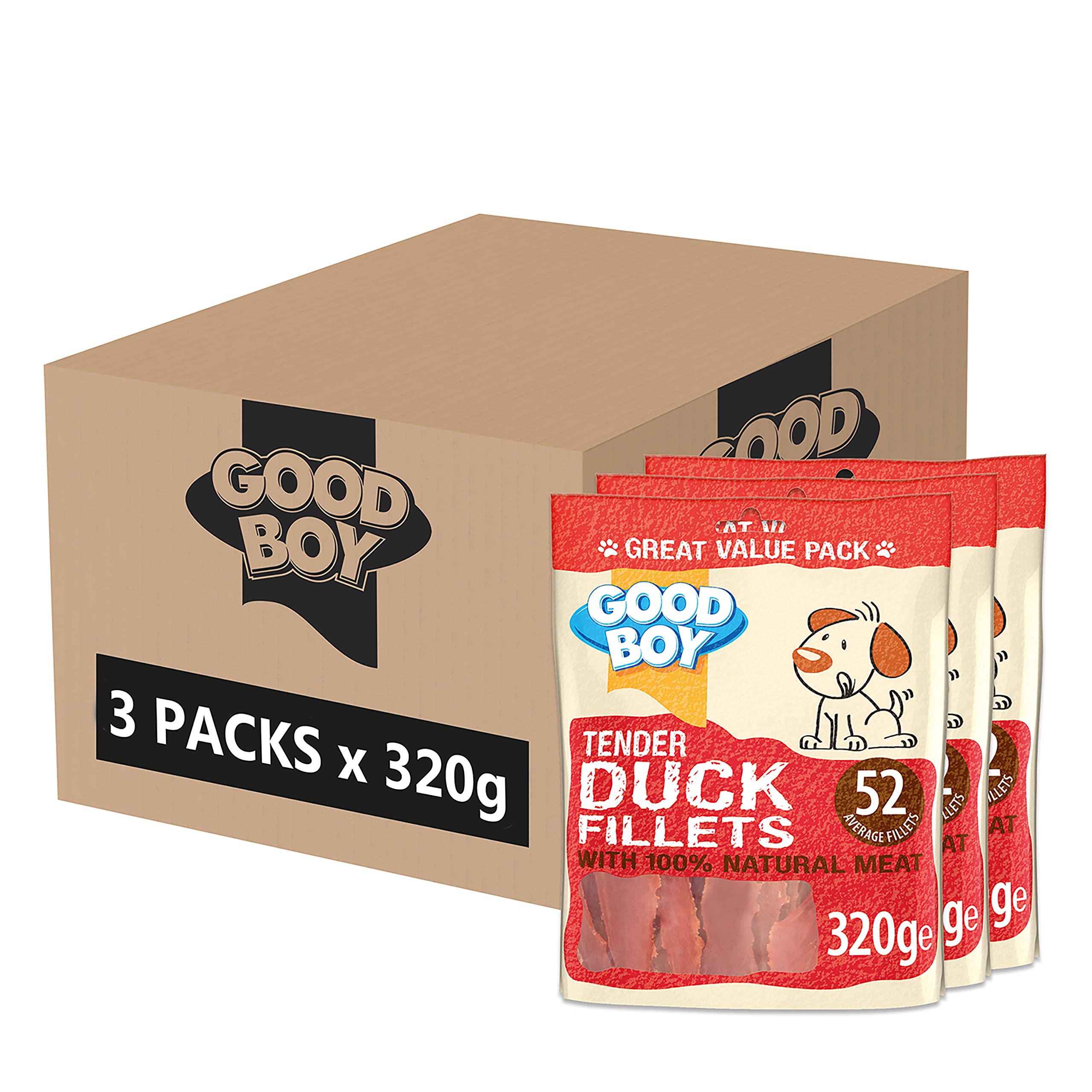 DescriptionProduct DescriptionOUR ETHOS Here at Good Boy we're all about quality, buckets full of fun and most importantly super tasty treats for your doggies. We know how important it is to feed your furry pet the right dog treats for their size, age and breed. We also know how important treats are for making your dog super happy. We have created a diverse range of dog treats in all different shapes, flavours and sizes to treat your dog on every occasion. WHY CHOOSE OUR TENDER DUCK FILLETS These low fat dog treats are made with 100% natural duck breast meat and are sure to get your dogs' tail wagging. There really is no better way to reward your dog than with a super tasty duck fillet. You can cut the fillet into small pieces for a scrummy bitesize treat or feed whole for a delightfully tasty meaty treat. THINGS YOU SHOULD KNOW This is a complementary pet food for dogs. Feed as a treat as part of a nutritionally balanced diet and make sure this treat is given to your dog under supervision, on a non-stainable surface. Check that your dog has plenty of clean, fresh water - just in case they get really thirsty. Not suitable for puppies under 4 months. To avoid potential choking hazard, ensure you choose a treat which is an appropriate size for the breed and age of your dog. This pouch may contain a deoxidiser sachet which must be discarded and not fed to your dog. Warning: This product is packed on a site that handles nuts and peanuts.IngredientsIngredients: Composition: Duck (87%), Glycerin, Tapioca Starch, Pea Protein, Salt. Analytical Constituents: Crude Protein 45%, Fat Content 2%, Crude Fibre 1%, Crude Ash 5.5%, Moisture 20%Box Contains3 x packs of treats