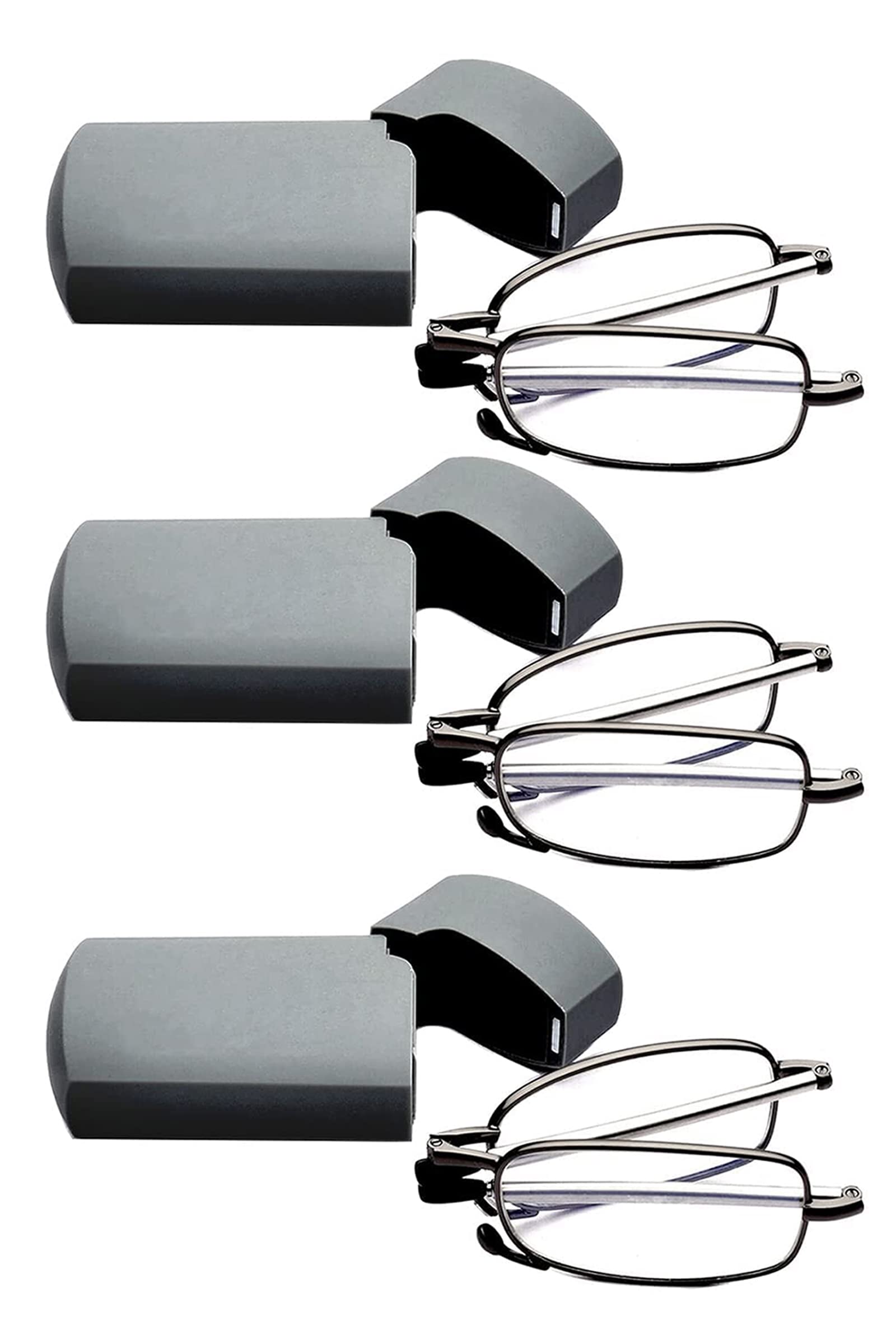GOOSEN 3-Pack Reading Glasses Men Women, Pocket Wallet Purse Compact Hard Cases Folding Readers, Blue light Glasses Spring Hinge, 3 Gunmetal 1.5 x