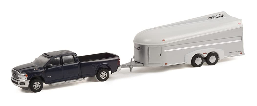 Greenlight 32240-D Hitch & Tow Series 24 - 2021 Ram 3500 Laramie Crew Cab in Maximum Steel Metallic Clear with Aerovault MKII Trailer in White and Bare Aluminum 1/64 Scale