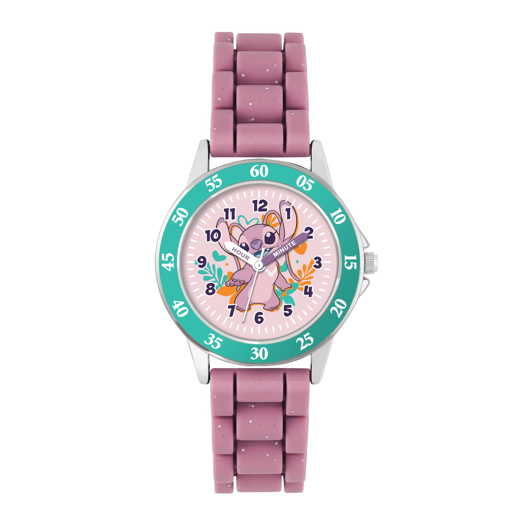 Disney Lilo & Stitch Angel Time Teacher watch with Angel Character printed dial, 3-hand analogue display, time-teaching feature, and pink soft silicone strap with traditional buckle fastening. Packaged in official branded packaging and comes with one year guarantee.