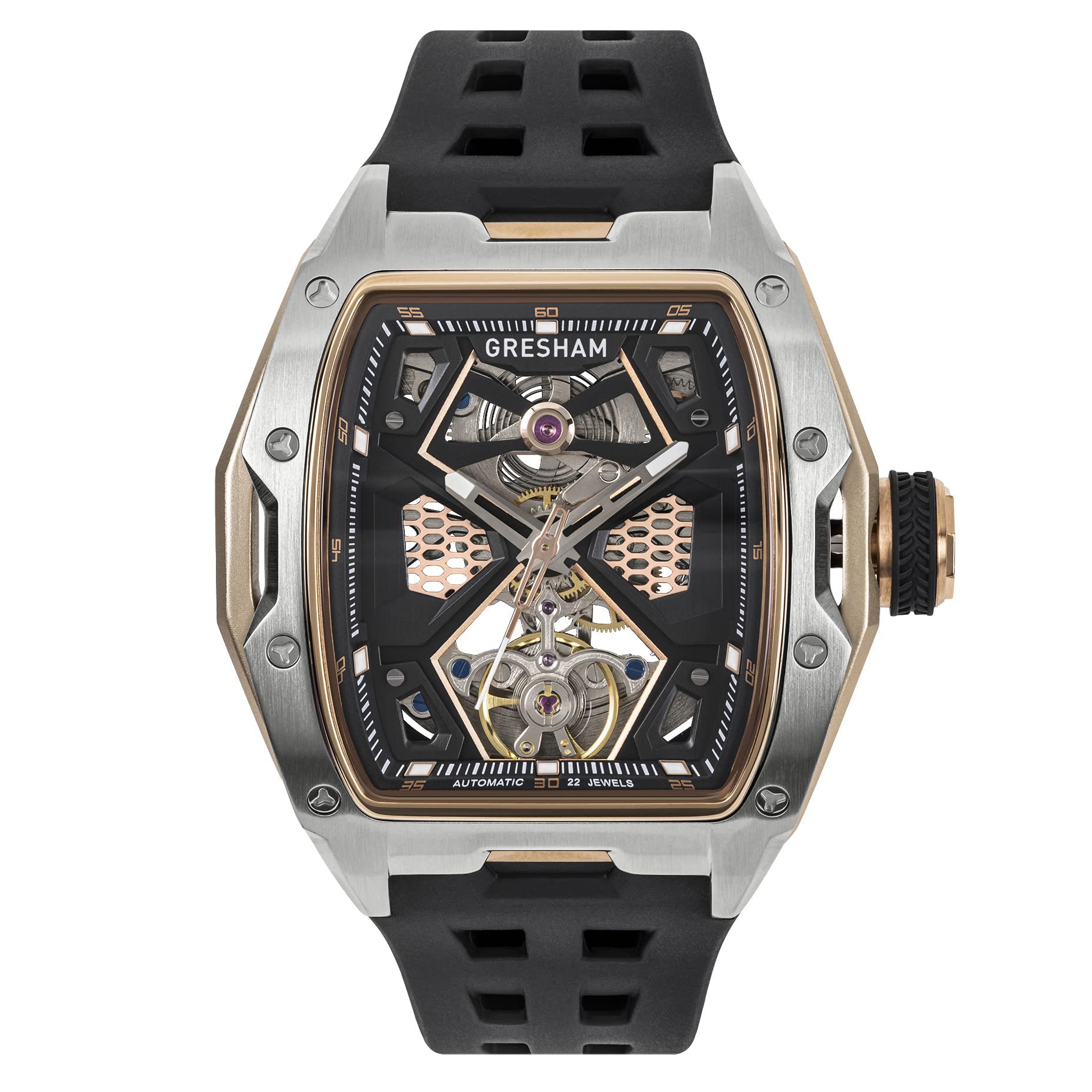 The Gresham Genesis G1 Special Edition Gresham introduces the latest in cutting edge watch design and construction, fusing architectural elegance with the intricacy of traditional watch making. The Genesis G1 features a hybrid steel and aluminium exo frame chassis which embodies the exposed skeleton custom automatic movement with self-winding mechanism. The case is seamlessly integrated on a custom designed, high density rubber strap. The 45mm case curves effortlessly front and back and features the multi forged stainless steel curved case back with exhibition window. The timepiece is 5atm water resistant. The G1 Genesis comes packaged in a gloss black, piano wooden box with aluminium certificate of authentication and comes with a 2-year international warranty.