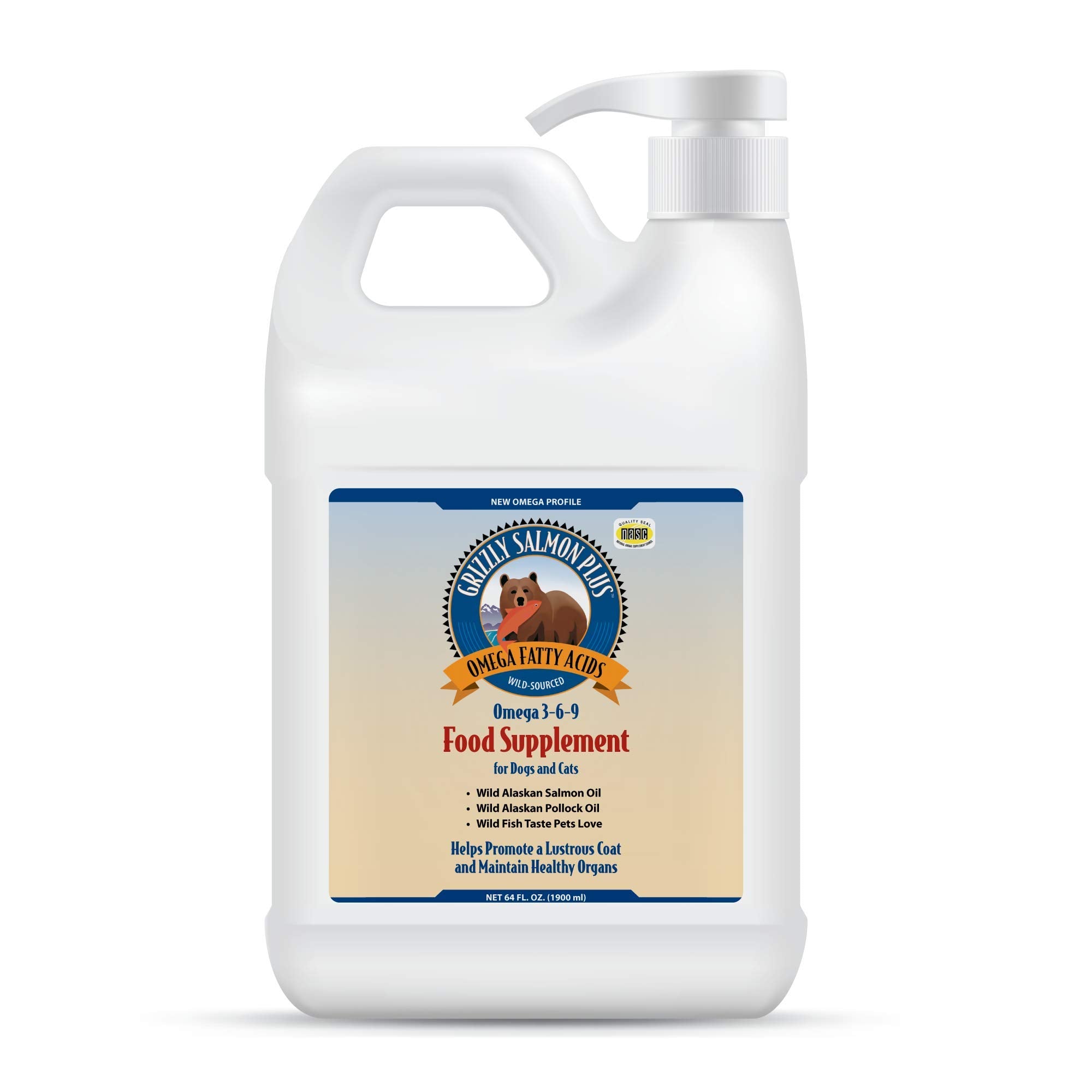Grizzly Salmon Oil (64 oz) is an all-natural, pure salmon oil supplement. Nutrient-rich salmon oil is used to strengthen your dog's heart and add shine to the coat.Grizzly Salmon Oil comes from wild Alaskan Salmon and contains natures blend of over 15 heart-healthy Omega-3 and Omega-6 Fatty Acids.Dogs naturally enjoy the rich salmon flavor.Supplies 10 different Omega-3 fatty acids, including DHA and EPA, an excellent source of these nutrients.Omega-3 fatty acids are used to increase energy level, improve the immune system, reduce the risk of blood clots, lower cholesterol and triglyceride levels and slow the growth of cancer cells.Also supplies Omega-6 fatty acids to benefit skin and coat, particularly in cases if excessive shedding and dry, itchy skin.Handy pump applicator.Ingredients:Salmon oil, rosemary extractGuaranteed AnalysisCrude fat.................... 99.9%Moisture...................... 0.1%Omega-3 Fatty Acids.......... 29.0%DHA (Docosahexaenoic Acid)... 12.0%EPA (Eicosapentaenoic Acid)... 9.0%Omega-6 Fatty Acids........... 3.0%Dosage:Dogs 1 to 25 lbs. - 1 Pump strokeDogs 25 to 50 lbs. - 2 Pump strokesDogs over 50 lbs. - 3 Pump strokes
