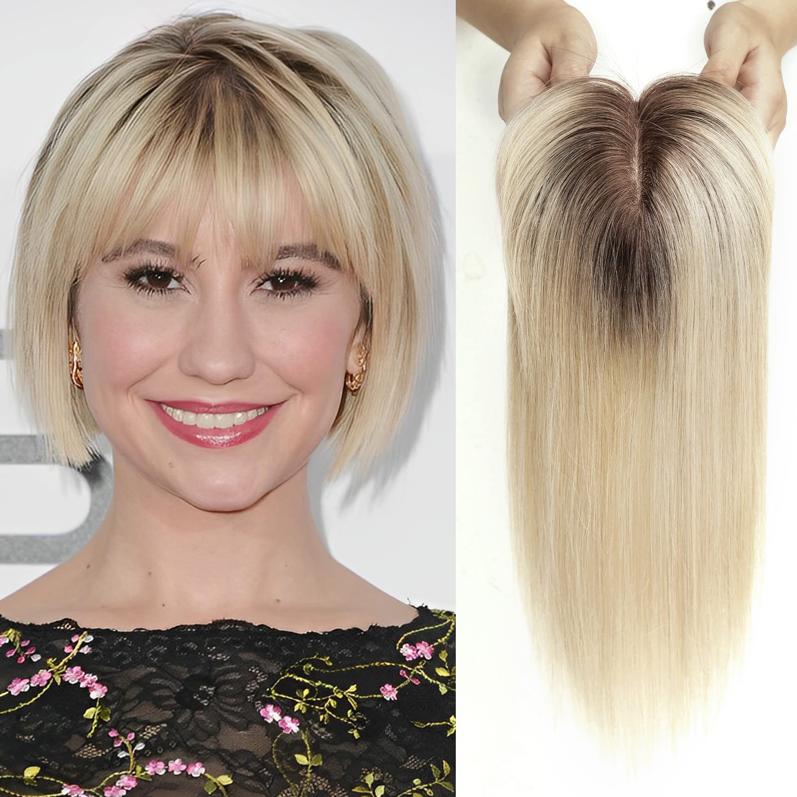 HAIRCUBE Human Hair Toppers For Women, 100% Remy With Bangs, 150% Density Silk Base Clip In 7 * 13cm Topper 10 inch 35g - Ombre Light Blonde.