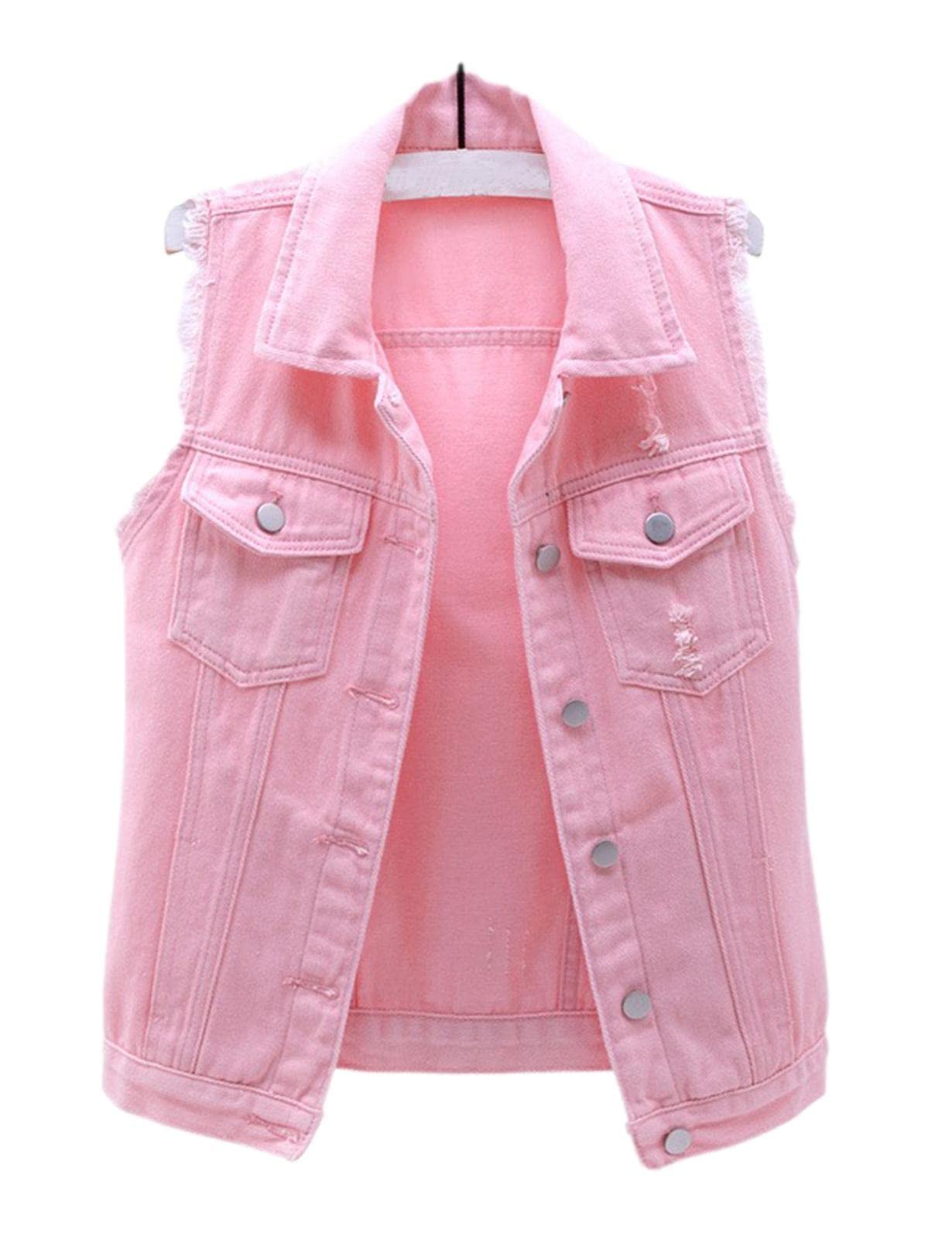 HALITOSS Women's Buttoned Washed Denim Jacket Sleeveless Crop Vest 6 Color - Pink - Large