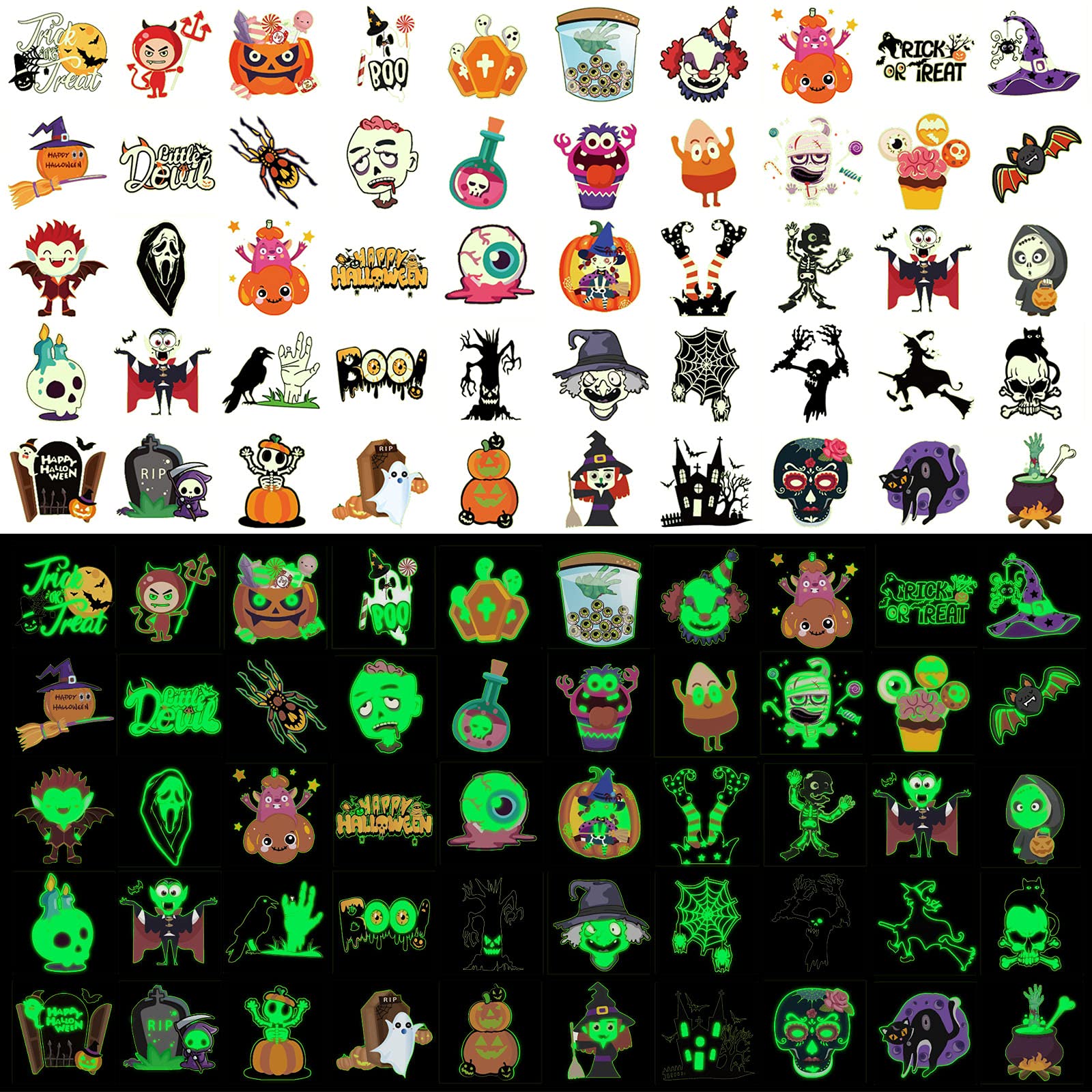 Halloween Assorted Luminous Temporary Tattoos for Kids, 48 Designs 96pcs Glow in the Dark Halloween Tattoos for Boys Girls Kids Halloween Party Favors, Trick or Treat Gifts Children's Party Bag Filler