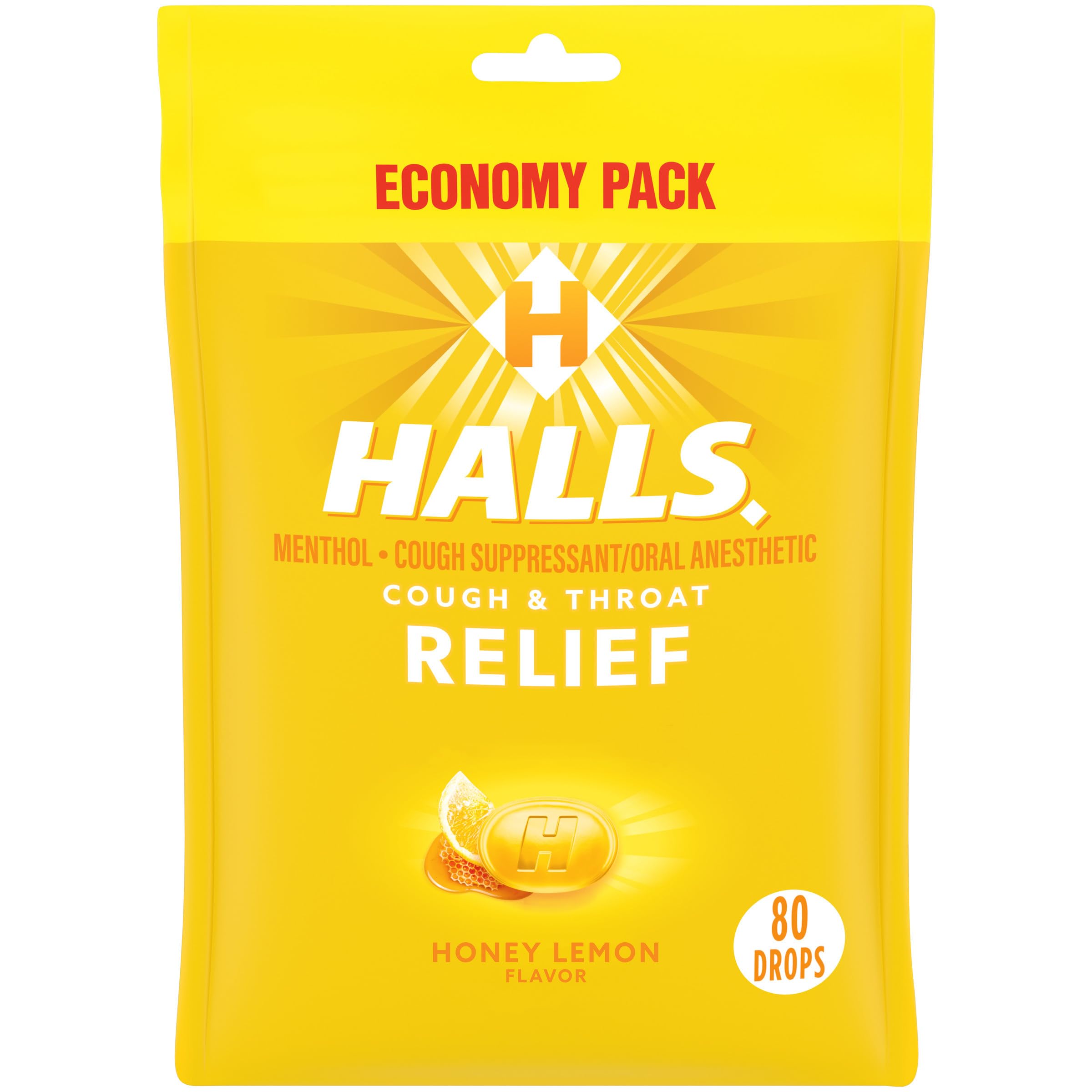 HALLS Relief Honey Lemon Cough Drops are ready for whatever life throws, or coughs, your way. Using the power of menthol, HALLS cough drops relieve coughs, soothe sore throats and cool nasal passages to relieve your worst symptoms. This effective cough suppressant comes in a soothing and refreshing honey lemon flavor. Whether you're using these menthol cough drops for sore throat relief, cough relief or as an oral anesthetic, dissolve one drop in your mouth slowly, and repeat every two hours as needed. HALLS Relief cough drops are formulated for adults and children five years and older. Each bag contains 80 throat lozenges each and is resealable, making it ideal for stowing in your travel pack, purse or desk drawer.