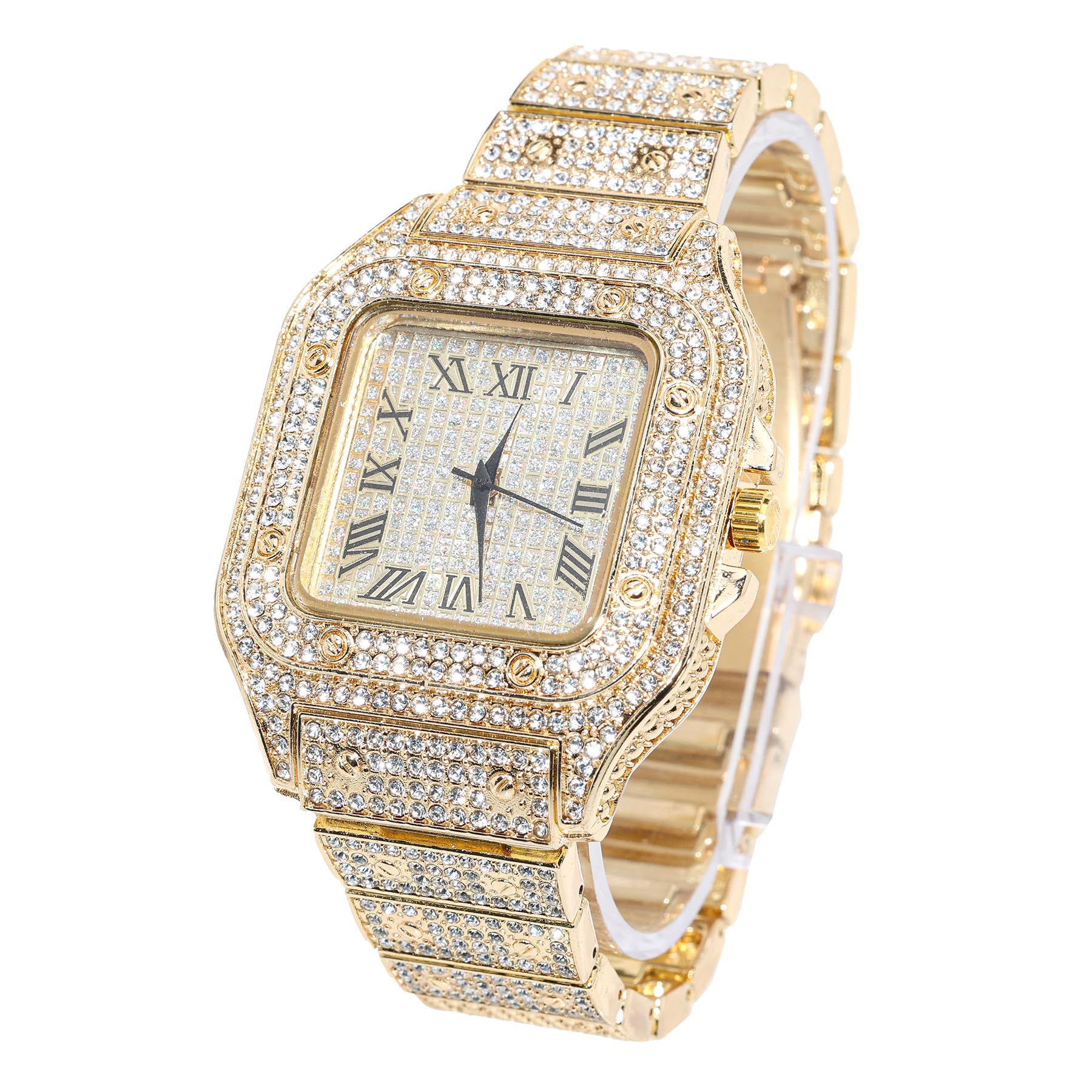 HALUKAKAH Square Dial Diamonds Gold Watch Iced Out, Men's 18k Real Gold Plated Quartz Wristband 24cm, Free Giftbox