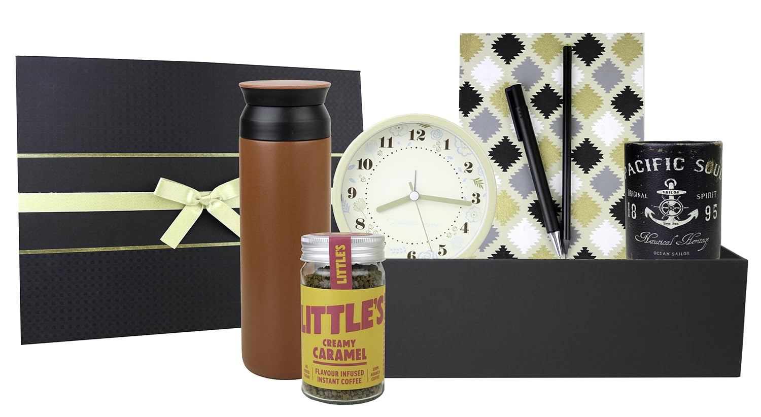 You have just found the perfect gift A Gorgeous Abstract Pattern Scarf and a luxury quality coffee, packed in a beautiful designer Black gift box with bow. They say that how you start your morning sets the tone for the rest of the day, so what a better way than starting it enjoying the feel of a super cosy scarf and a perfect cup o Lavazza coffee! The Gift Hamper contains: 1 Abstarct pattern scarf, 1 Lavazza Intenso coffee 95g 1 300 ml Stainless Steel Flask 1 B5 Spiral Notebook 1 Ball Point Pen 1 Cystal Pencil 1 Treacle Toffee Fudge Please note that the contents of this hamper are subject to change due to availability and seasonality of the products. If we do have to change any of the goodies, then we will always substitute them for items of equivalent or higher value.