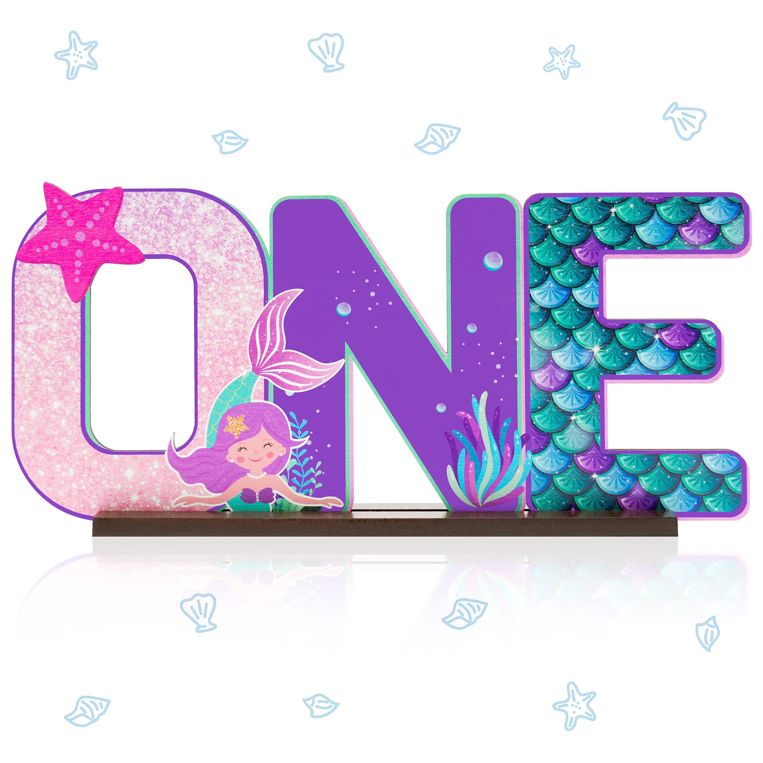 Haooryx Mermaid ONE Letter Sign Table Wooden Centerpiece for Baby Girl 1st Birthday Party Decorations, Under The Sea Little Mermaid First Birthday Theme Party Sign Baby Shower Decor Supplies