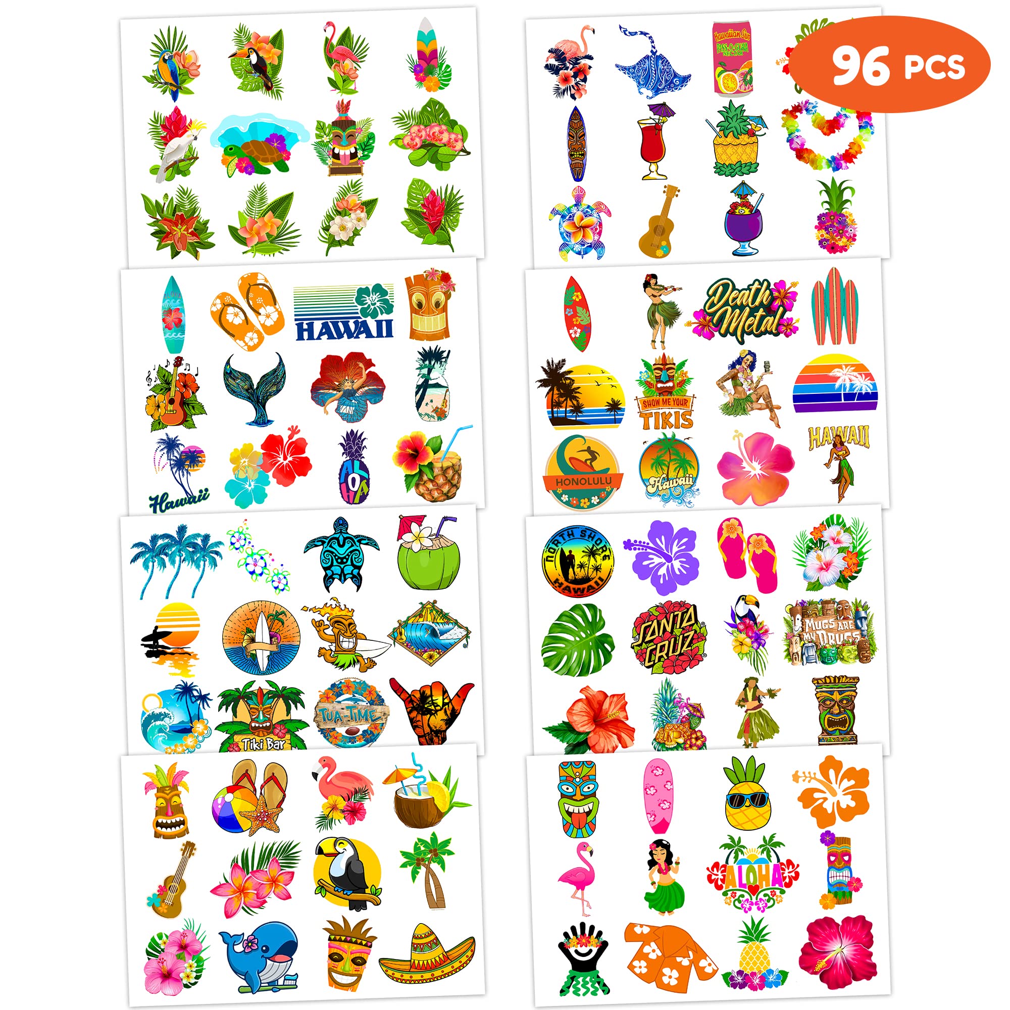 Hawaiian Luau Summer Beach Birthday Party Supplies: 8 Sheets Hawaiian Luau Summer Beach temporary tattoos stickers, Have a variety of cartoon themed characters, Children can easily Hawaiian Luau Summer Beach stickers and take unique photos to make fond memories. The size of each sheet is 6.1 * 3.1 inches. Hawaiian Luau Summer Beach Birthday Party Decoration: The set contains instructions for use and is easy to use. Hawaiian Luau Summer Beach tattoo stickers can be applied on arms, face, hands, neck, shoulders, legs, wrists and ankles to make you look cool at all kinds of parties. Popular hit with your kids. You can apply them to your body or some smooth objects, for example, glass, stationery, paper, crafts cups, cabinet, bottle. Cute And Funny Hawaiian Luau Summer Beach Themed Tattoos: Cute Hawaiian Luau Summer Beach Temporary tattoos Stickers, features an assortment of themed characters, colors are bright, and designs are adorable, use them as party favors and your kids will love. Perfect for themed party, birthday activities, school reward and other party events. They will be your kids' favorite small gifts. More Safety & Healthy Choice: These temporary tattoos are made of high quality safety and green paper, Non-allergenic, Non-toxic and totally safe for your kid's skin. Simply wet the tattoo with water and stick transferred them onto your body, hands, faces and arm you like. Tattoos will last from 3 to 5 days ,it also can be easily removed with baby oil, makeup remover or rubbing alcohol. Not recommended for people with a history of sensitive skin, if symptoms appear, stop using immediately. How to Use: Cut out tattoo of choice and remove clear sheet. Place tattoo face down on skin. Wet the tattoo thoroughly with a sponge. After 20-30 seconds, gently remove the backing paper. Allow the tattoo to dry. Very easy to use.