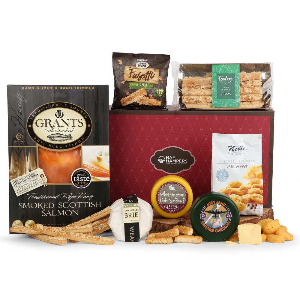 This luxury cheese hamper contains three stunning cheeses; an oak smoked cheddar cheese, a vintage cheddar and a British soft Brie. There is also Scottish smoked salmon to be enjoyed with the seeded breadsticks, flaky cheese straws and moreish cheese biscuits with black pepper.