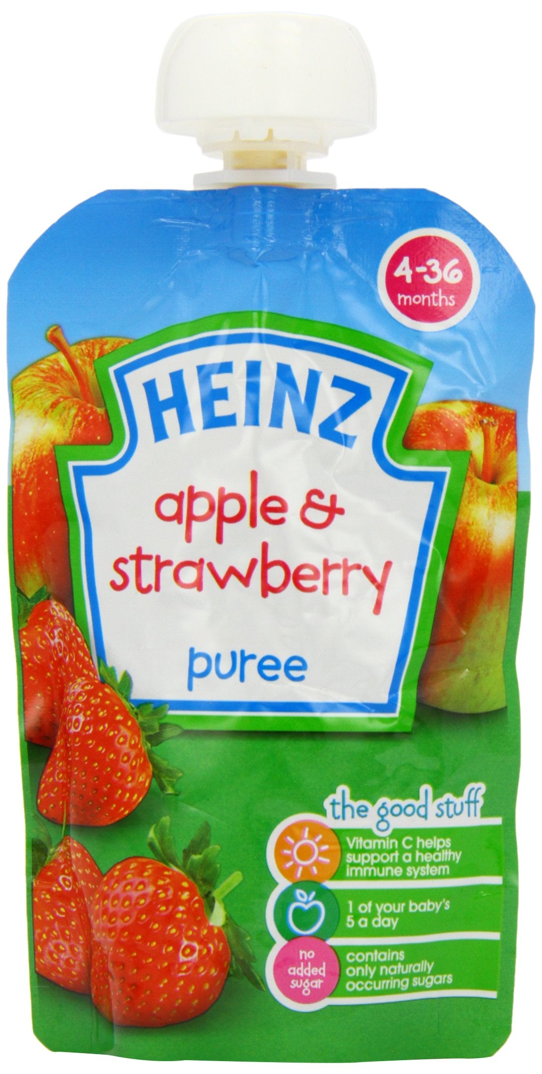 DescriptionProduct DescriptionAvailable in 20 tasty recipes, we’ve packed loads of delicious goodness into our range of pouches. Each fruit pouch contains 60% of your little one’s daily Vitamin C to support a healthy immune system, while the savoury ones are fortified with iron for healthy brain development. Our pouches also come in two textures. The 4+ months variety helps your baby learn to take food off the spoon, while the more mashed texture of the 7+ month ones helps them learn to chew.This pack contains a smooth blend of apple and strawberry with added Vitamin C. It is 1 of your baby's 5 a day. Contains only naturally occurring sugars .Suitable for vegetarians. Gluten Free. No added milk or egg. No artificial colours, flavours or preservatives.IngredientsFruit (100%, Concentrated Apple Puree (90%), Strawberries (10%), Concentrated Lemon Juice), Vitamin CDirectionsEasy peasy prep. Remove cap and keep it out of reach of your baby. Squeeze contents into a bowl or straight onto a spoon. To warm stand in hot water. Always check the temperature before serving. Never microwave the pouch.Box Contains6 x 100 g Apple and Strawberry Puree Pouch