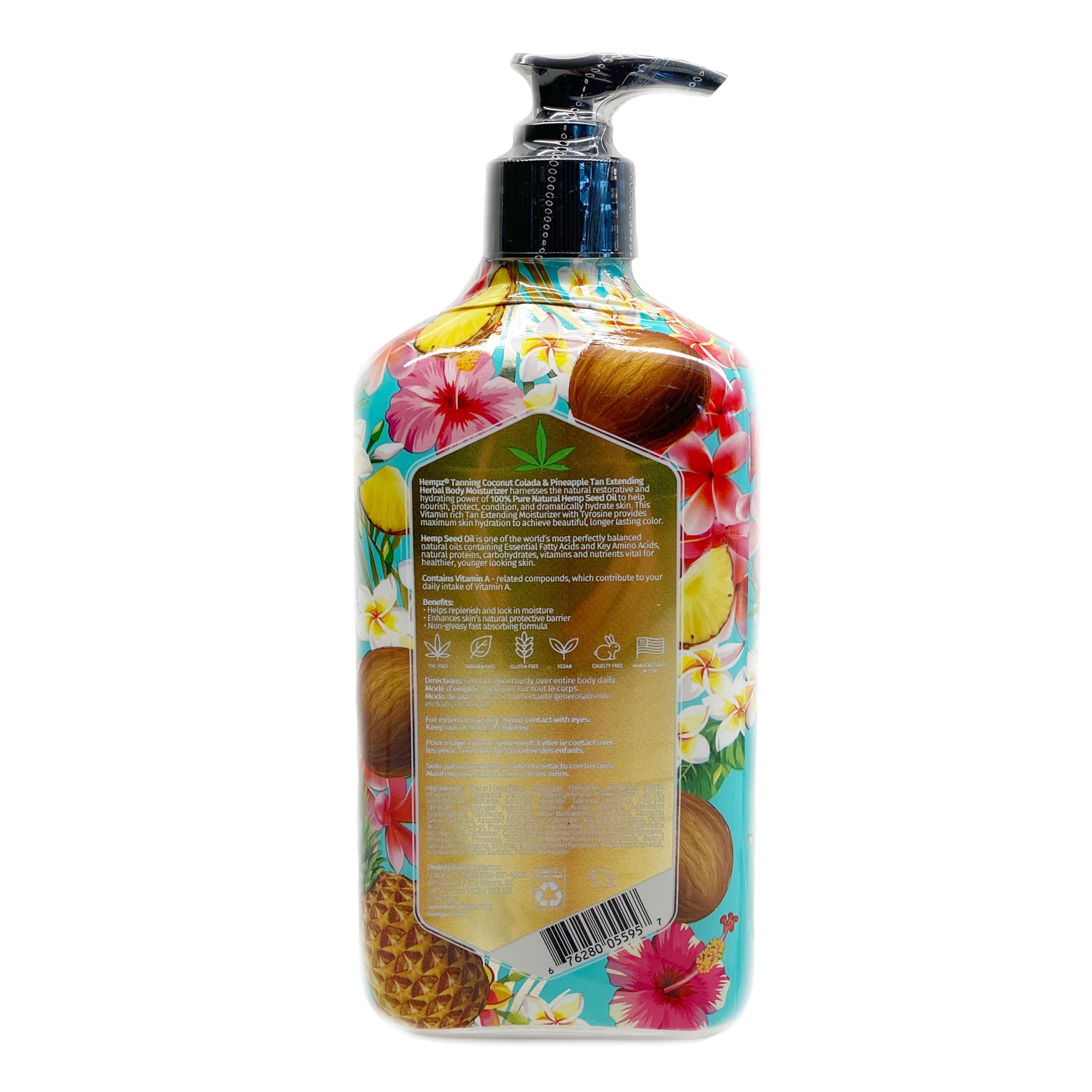Hempz Coconut Colada & Pineapple Herbal Tan Extending Moisturizer harnesses the natural restorative and hydrating power of 100% Pure Natural Hemp Seed Oil to help nourish, protect, condition, and dramatically hydrate skin. This Vitamin rich Tan Extending Moisturizer with Tyrosine provides maximum skin hydration to achieve beautiful, longer lasting color. Hemp Seed Oil is one of the world’s most perfectly balanced natural oils containing Essential Fatty Acid’s and Key Amino Acids, natural proteins, carbohydrates, vitamins and nutrients vital for healthier, younger looking skin.