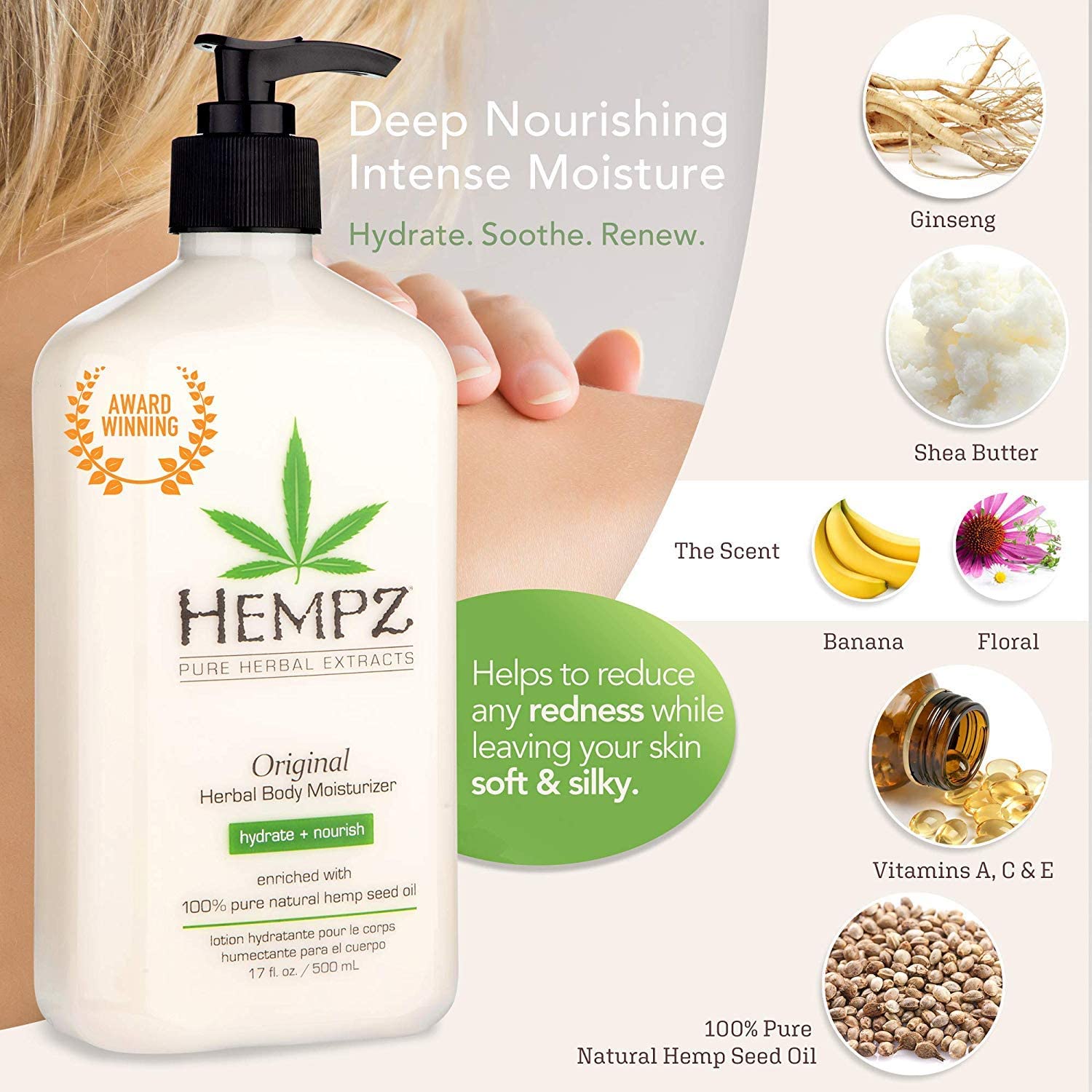 Hempz Original herbal Body Moisturizer is enriched with 100% pure Natural Hemp Seed Oil and blended with natural extracts to provide dramatic skin hydration and nourishment to help improve the health and condition of skin. Hemp Seed Oil is one of nature's richest sources of Essential fatty acids and Key Amino Acids containing natural proteins, vitamins, antioxidants, and minerals, vital for healthy skin conditioning. Paraben free. Gluten Free. 100% Vegan.