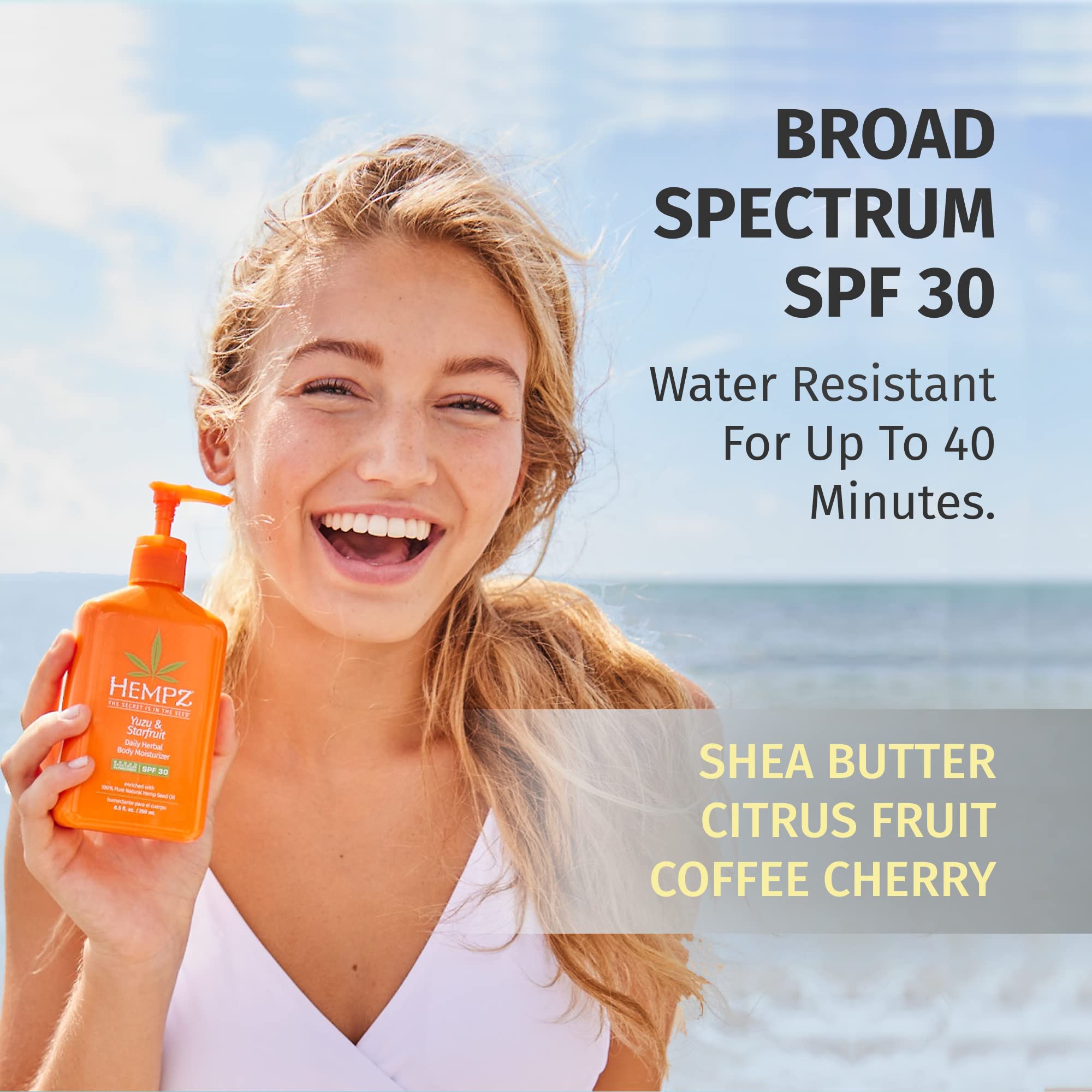 Deeply nourish, hydrate and protect your skin with this Yuzu & Starfruit Daily Herbal Moisturizer with SPF 30 by Hempz! This is a lightly scented, weightless daily moisturizer that absorbs quickly, without leaving behind streaks or residue, while protecting against the effects of free radical damage, harmful UVA/UVB rays, daily elements and sun exposure. Our everyday lotion has powerful, Broad Spectrum SPF 30, making it the perfect addition to your beauty routine to prevent sunburn. Our exclusive body moisturizer is enriched with a natural, proven formula that will leave skin soft, smooth, and hydrated. It includes 100% Pure Natural Hemp Seed Oil, which provides skin with protein, carbohydrates, nutrients, key minerals and fiber. Your complexion will be soothed, calmed and softened with a combination of Chamomile, Shea Butter, Coffee Cherry Extract, Vitamins A, B, C and E, and our signature Citrus Fruit Complex. With a gentle, fruity and floral fragrance, our everyday body lotion with SPF 30 is THC-free, gluten-free, paraben-free and vegan, making it ideal for adults and children. It is easy to use for sun protection at the beach, park, and while on camping trips. Just apply liberally 15 minutes before sun exposure, and reapply at least every 2 hours. We recommend using it with a water-resistant sunscreen if swimming or sweating. Our natural SPF body lotion will improve your skin’s overall health and appearance while defending against sun exposure and reducing wrinkles and dark spots. Product Details: (1) Yuzu & Starfruit Daily Herbal Moisturizer with SPF 30 Size: 8.5 fl. oz/250 mL Scent: Yuzu & Starfruit.