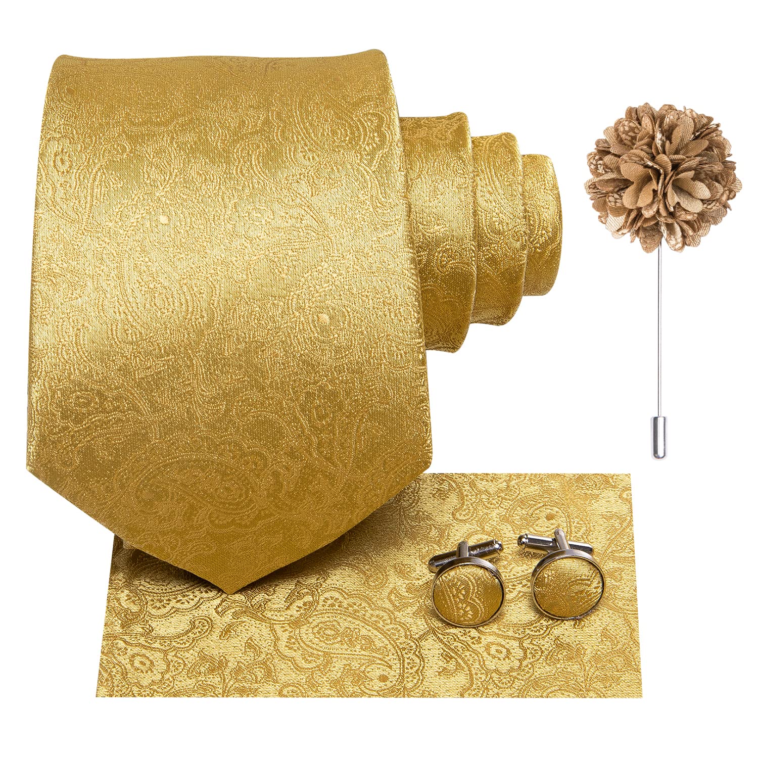 Hi-Tie Silk Paisley Mens Gold Ties for Wedding Jacquard Woven Tie Pocket Square Lapel Pin Link Cuffs Set Daily Necktie
