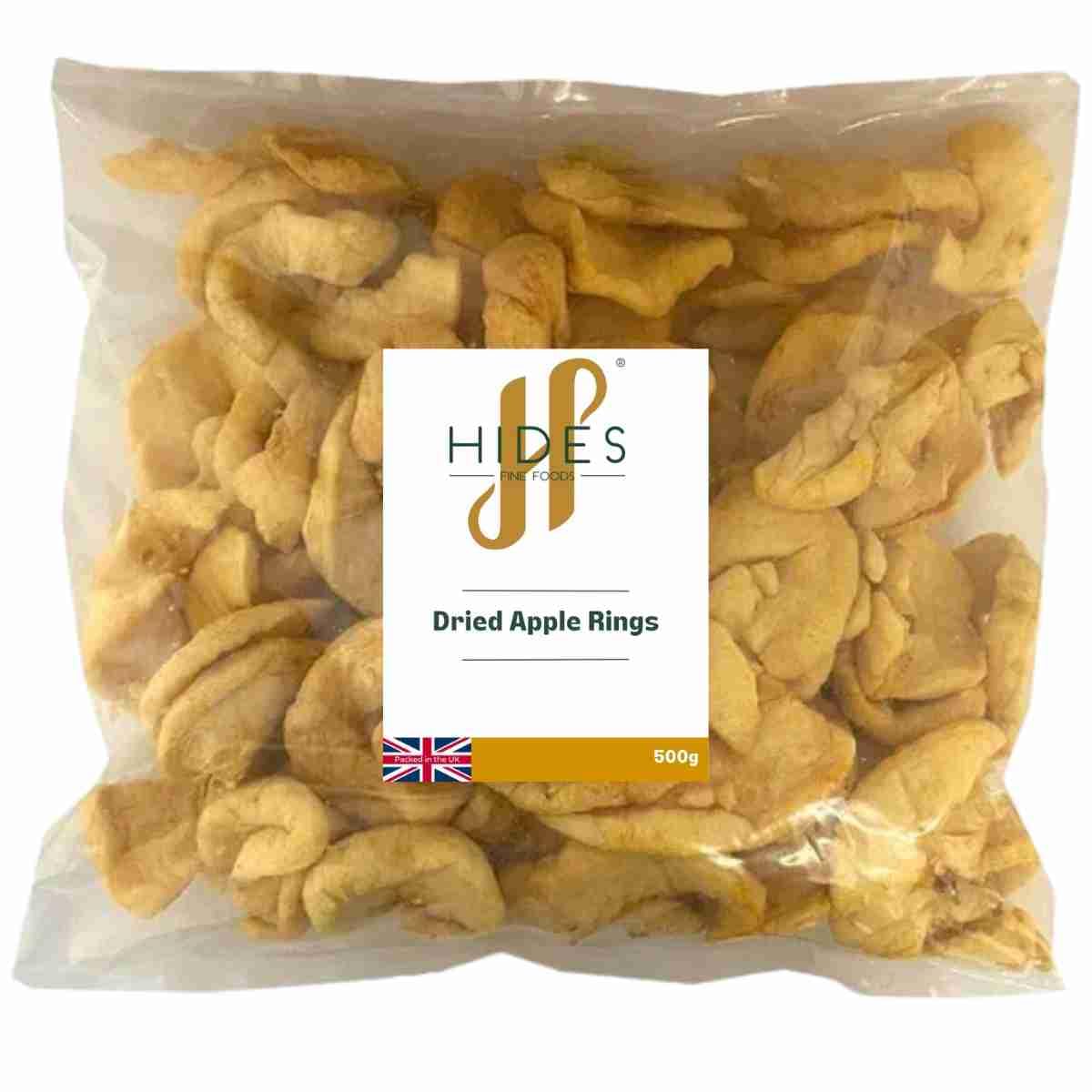 Hides Fine Foods - Dried Apple Rings 500g - GMO Free - Suitable for Vegetarians Apples are an excellent source of fibre, vitamins and minerals. One of your five-a-day and vegetarian, dried apple rings should be a kitchen staple! These dried rings are a perfect addition to any breakfast. They work especially well as a topper for porridge. We have so much faith in our dried apple rings that we know that they’re not limited to breakfast. You could make them into an apple sauce for pork, or simply as an alternative to crisps. Excellent for snacking on, these apple rings are perfect to take to work or school as a sweet but nutritious snack. Minimalistic food-grade packaging, made out of recyclable plastic. Minimum waste, maximum flavour. This family-run business is full of love, packed in the UK to the highest standard.