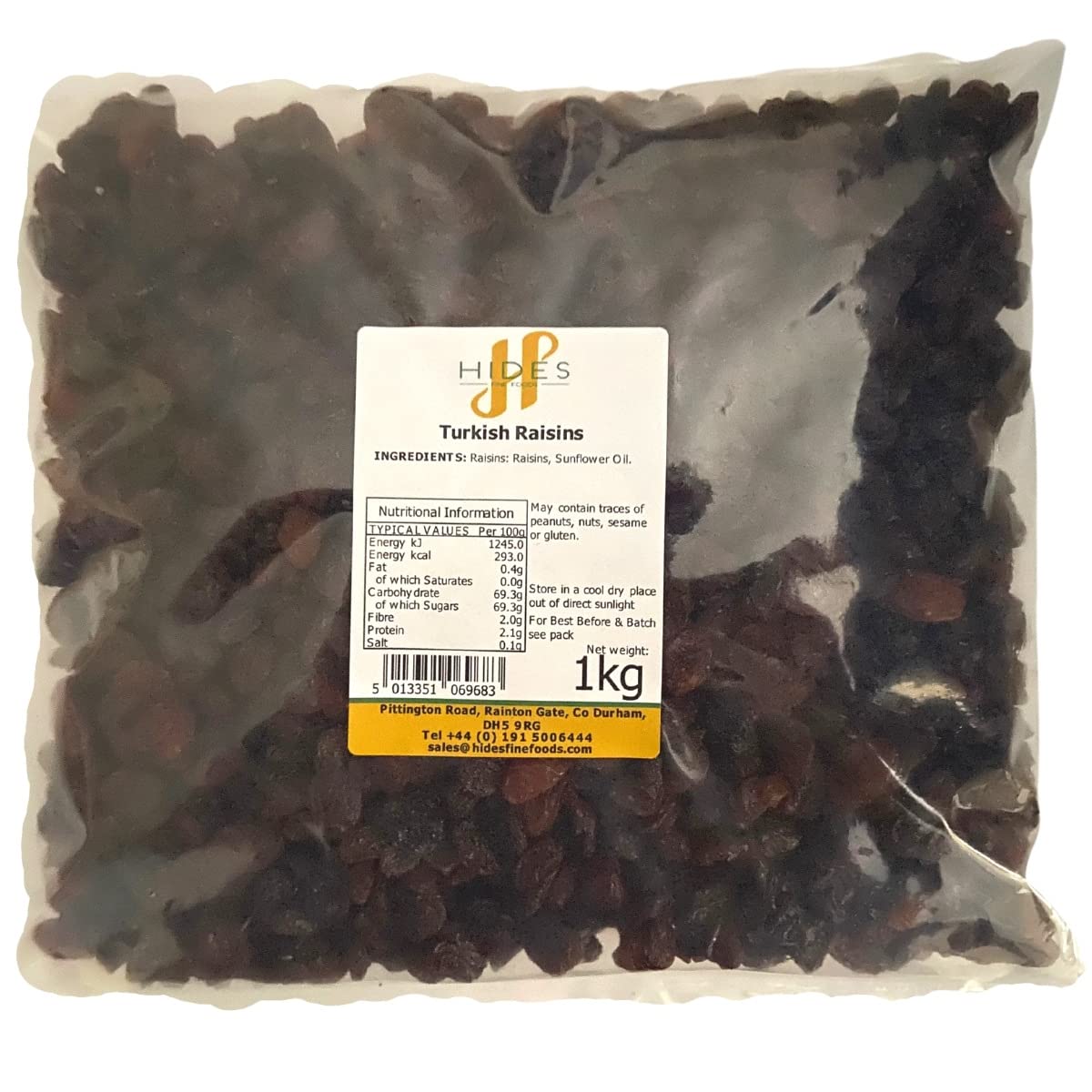 Hides Fine Foods - Turkish Raisins 1kg - GMO Free - Suitable for Vegetarians - Baking - Desserts - Cakes - Cookies - Tart - Mince Pies - Granola These Turkish Raisins are a great store cupboard essential, perfect for Christmas but also flourishing all year round. Excellent for making scones, cakes and biscuits. They're also a good source of Vitamins and Minerals! Why not add our Turkish Raisins to cakes or cookies? They're so good, you might not be able to resist snacking on them! Raisins are a staple when Christmas rolls around. Forming the base of wonderful mince pies and Christmas cakes always reminds us of the festive season. Minimalistic food-grade packaging, made out of recyclable plastic. Minimum waste, maximum flavour. This family-run business is full of love, packed in the UK to the highest standard.