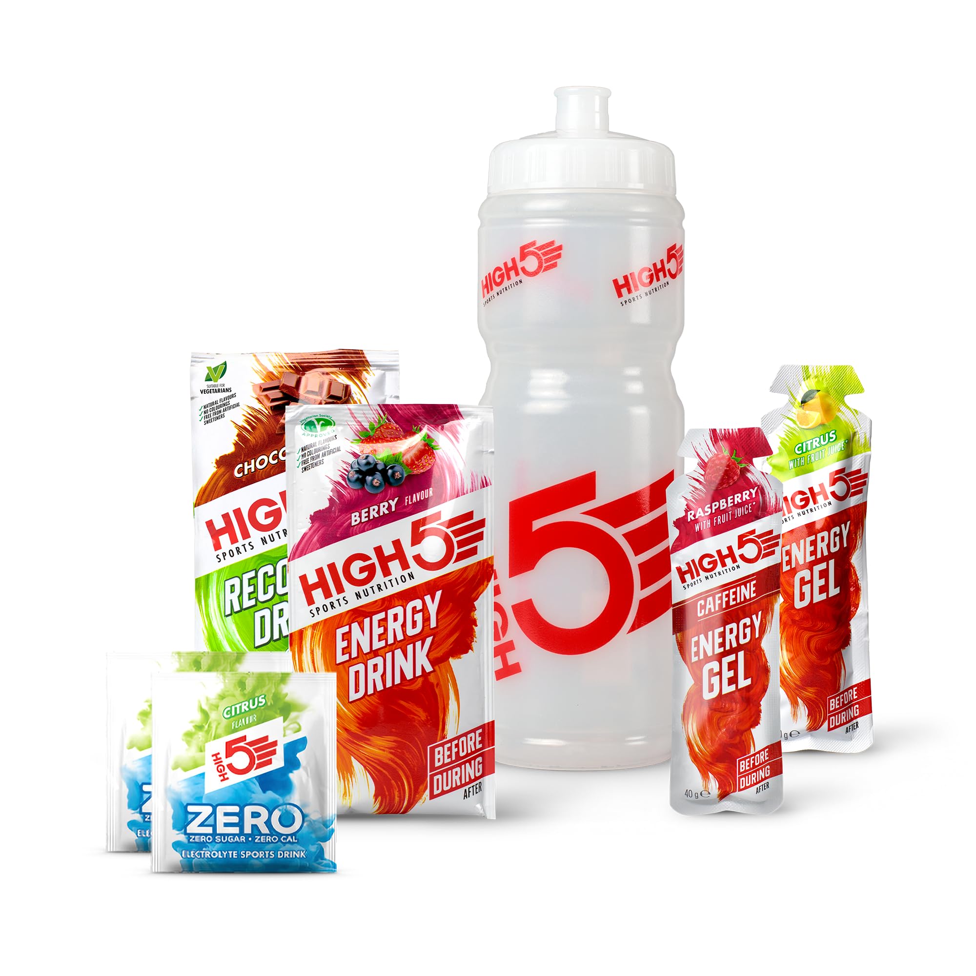 DescriptionProduct DescriptionThe HIGH5 Starter Nutrtion Pack is a selection of HIGH5's best selling Energy, Hydration and Recovery products. Whether you are new to sports nutrition or stocking up for a training sessions or an event, this pack is full of all your nutrition essentials.The HIGH5 Starter Kit includes: 1x Energy Gel, 1x Energy Gel Caffeine. 1x Energy Drink sachet, 1x Recovery Drink sachet, 2x ZERO (1tab) sachet, 1x ZERO Caffeine Hit (1tab) sachet.Please consider the environment and keep the countryside clean by taking your empty wrappers with you after use.IngredientsAcidity Regulators (Citric Acid, Malic Acid), Sodium Bicarbonate, Firming Agent (Sorbitols), Magnesium Carbonate, Sodium Citrate, Potassium Citrate, Natural Flavouring, L-Ascorbic Acid (Vitamin C), Calcium Carbonate, Sweetener (Sucralose), Maltodextrin, Leucine, Green Leaves Tea Extract (Camellia Sinensis O.Ktze), Sodium Chloride, Colour (Riboflavins). Acidity Regulators (Citric Acid, Malic Acid), Sodium Bicarbonate, Firming Agent (Sorbitols), Magnesium Carbonate, Sodium Citrate, Potassium Citrate, Natural Flavourings, Beetroot Concentrate, Caffeine , Sweetener (Sucralose), L-Ascorbic Acid (Vitamin C), Calcium Carbonate, Leucine, Green Tea Leave Extract (Camellia Sinensis O. Ktze), Sodium Chloride, Colour (Riboflavins). Glucose Syrup, Water, Maltodextrin, Fruit Juice Concentrate (Lemon 1 Percent, Lime), Acidity Regulator (Sodium Citrates), Preservatives (Potassium Sorbate, Sodium Benzoate), Sea Salt, Natural Flavouring, Vitamin B6. Maltodextrin, Fructose 32 Percent, Natural Flavourings, Food Acids (Citric Acid, Malic Acid), Acidity Regulators (Sodium Citrates, Potassium Citrate), Sea Salt. Glucose Syrup, Water, Maltodextrin, Fruit Juice Concentrate (Raspberry 1 Percent, Cranberry), Acidity Regulators (Citric Acid, Sodium Citrates, Malic Acid), Preservatives (Potassium Sorbate, Sodium Benzoate), Natural Flavouring, Caffeine, Sea Salt, Vitamin B6. Dextrose, Whey Protein Isolate 30 Percent (MILK), Maltodextrin, Fructose, Cocoa Powder 9 Percent, Stabiliser (Carrageenan Gum), Emulsifier (SOY Lecithin), Natural Flavourings.Box Contains1 x Energy Gel 40g, 1 x Energy Gel Caffeine 40g, 1 x Energy Drink 47g, 1 x Recovery Drink 60g, 3 x ZERO single tablets, 1 x 750ml bottleManufacturer Contact InformationHIGH5, Sea View Way, Brighton, BN2 6NT, UK