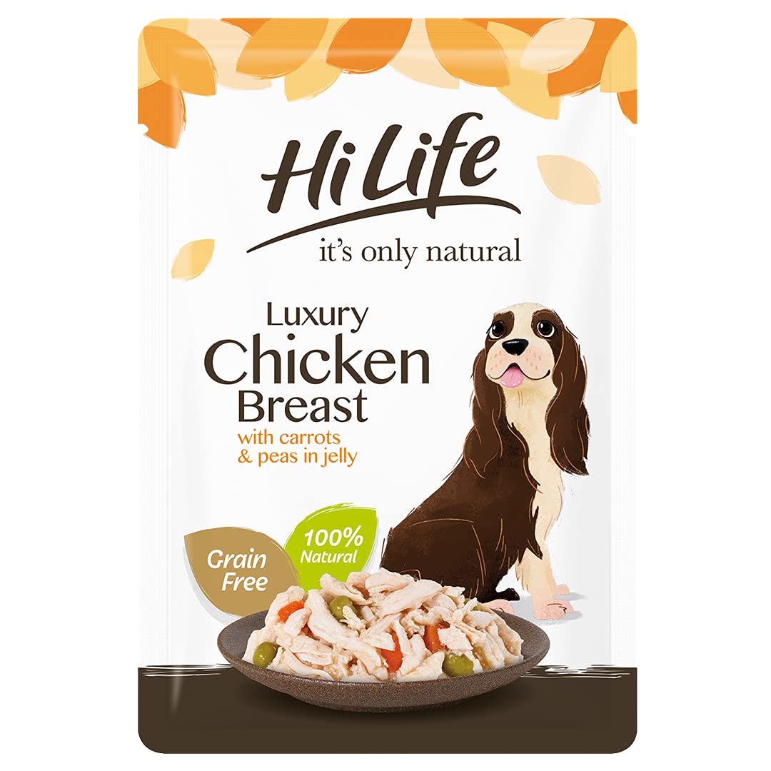 Product DescriptionHiLife It's Only Natural Luxury Dog Food Chicken Breast with Carrots and Peas in Jelly, 15 x 100g PouchesIngredientsChicken Breast (50%), Carrots (5%), Peas (5%), minerals.DirectionsStore in a cool, dry placeBox ContainsEach box contains 15 x 100g Pouches of HiLife It's only Natural Dog Food
