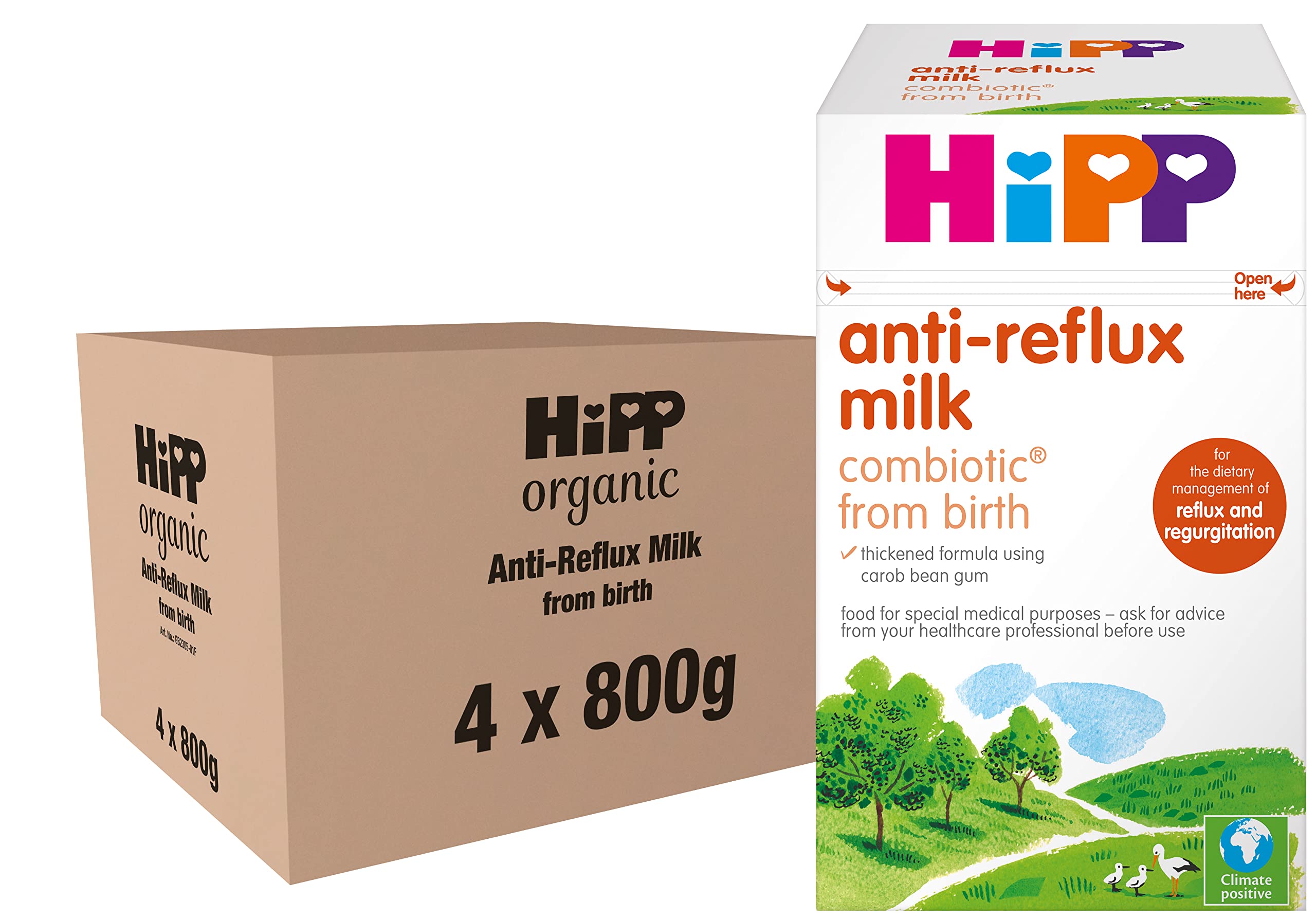DescriptionIngredientsSkimmed Milk, Whey Product, Vegetable Oils (Palm Oil, Rapeseed Oil, Sunflower Oil), Lactose, Thickening Agent Locust Bean Gum, Fish o\Oil, Potassium Chloride, Choline, Mortierella Alpina-Oil, Calcium Carbonate, Sodium Citrate, L-phenylalanine, Sodium Selenite, L-tyrosine, Zinc Sulphate, Calcium Salts of Orthophosphoric Acid, L-leucine, L-tryptophan, L-histidine, Ferrous Sulphate, Potassium Iodate, Vitamin C, Vitamin E, Niacin, Pantothenic Acid, Cupric Sulphate, Vitamin B1, Vitamin A, Magnesium Carbonate, Inositol, Vitamin B6, Folic Acid, Vitamin K, Vitamin D, D-biotin, Vitamin B12. Allergy Advice - See Ingredients Shown in BOLD.Product DescriptionHiPP Anti Reflux Milk Powder Formula. A nutritionally complete, thickened milk powder formula specifically designed for babies with frequent reflux and regurgitation. HiPP’s Anti Reflux Milk Powder Formula is formulated with carob bean gum, a natural thickener, which allows the formula to thicken in the bottle. Suitable from birth as your baby’s sole source of nutrition or as part of a varied weaning diet when introduced from around 6 months, HiPP Anti Reflux Milk Powder Formula is a food for special medical purposes and should only be used under medical supervision. Stefan Hipp, one of the fourth-generation family owners of HiPP, personally guarantees every product we make, just as his family has done for over 120 years. HiPP quality is something particularly special and important to us. Legislation does not allow any specialist milks, such as anti-reflux, to be certified organic, however you can be reassured that our anti-reflux milk has been made to our usual high standards and strict quality controls. HiPP Anti Reflux Milk Powder Formula has different preparation instructions. Please follow the instructions written on the packaging carefully and use measuring scoops provided in the box. As required by the legislation of all infant formula.DirectionsHiPP Anti Reflux Milk Powder Formula has different preparation instructions. Please follow the instructions written on the packaging carefully and use measuring scoops provided in the box.Safety WarningThis product left our factory in a faultless condition - please ensure that the inner foil bags are undamaged before use.Box ContainsEach order comes with 4 x HiPP Anti Reflux Milk from birth 800 gManufacturer Contact InformationHiPP UK Ltd, Hurst Grove, Sandford Lane, Hurst, Reading RG10 0SQ. In EU: HiPP GmbH and Co. Vertrieb KG, D-85273 Pfaffenhofen