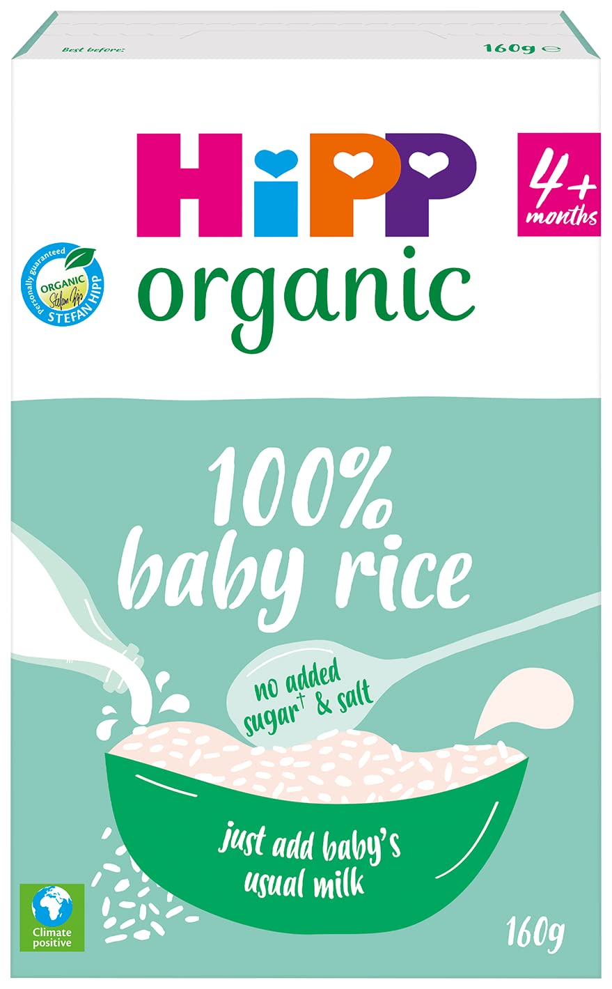 DescriptionProduct Description100% organic rice flakes. Our delicious breakfast cereals are made with the finest organic ingredients, packed with energy and important nutrients to give your baby the best possible start to the day. Stefan Hipp, one of the fourth-generation family owners of HiPP organic, personally guarantees every product we make, just as his family has done for over 120 years. HiPP organic quality is something particularly special and very important to us. We don't just meet EU organic standards, we exceed them. To achieve this, we work with nature rather than against it, in a sustainable way that protects bio-diversity, helping us to produce the best possible organic ingredients. Family owned sustainable business. Hipp Organic - Good natured since 1899. Ingredients Rice Flour* (100%), Thiamin (Vitamin B1). *OrganicIngredientsRice Flakes (100%), Thiamin (Vitamin B1)*, All ingredients are organic, unless stated, *from non-organic sources Allergy Information: Free From GlutenDirectionsMixing Guide Mix 1 level tablespoon (approx 1.3g) of HiPP Organic baby rice with about 1 tablespoon (15ml) of baby's usual warmed milk in a clean bowl to produce a smooth consistency. As weaning progresses, increase the amounts used according to baby's age and appetite. Always test the temperature before serving to your baby. Look after those first tiny teeth and brush regularly after feeding. This product left our factory in a faultless condition - please ensure that the inner foil bag is undamaged before feeding.Box ContainsEach order comes with 4 x 160g HiPP Organic Stage 1 From about 4 Months Baby RiceManufacturer Contact InformationHiPP UK Ltd, Hurst Grove, Sandford Lane, Hurst, Reading RG10 0SQ. In EU: HiPP GmbH and Co. Vertrieb KG, D-85273 Pfaffenhofen