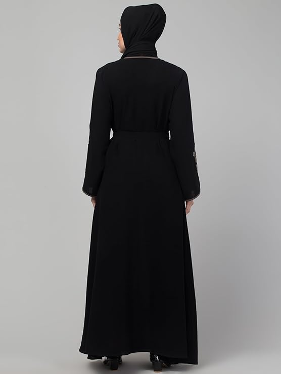 HIZFASON BARAND:This is a designer shrug style abaya with an attached upper layer. Unique embroidery work on front panel ,chest and bottom work gives a stunning looks. This is made of Nida matte fabric. It comes with a complementary Hijab that makes it more affordable. One of the best abayas anyone can have in their wardrobe.