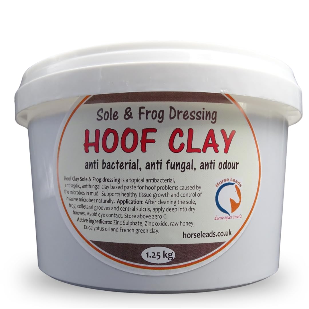 HOOF CLAY, Antibacterial and Antifungal Sole and Frog Dressing 1.25 KG by Horse Leads Hoof Clay is a fabulous product for muddy fields. Contains natural active ingredients; Eucalyptus Oil, French Green Clay, Zinc Sulphate, Zinc Oxide and Bio Active Honey. Hoof Clay is a fabulous product, just clean out your horses feet and preferably using rubber gloves, because it has excellent stickability, apply a thin layer getting into the central sulcus and collateral grooves. Just clean out your horses feet and apply a thin layer getting into the central sulcus and collateral grooves. This is an excellent product and a good amount in the tub 1.25 kg!