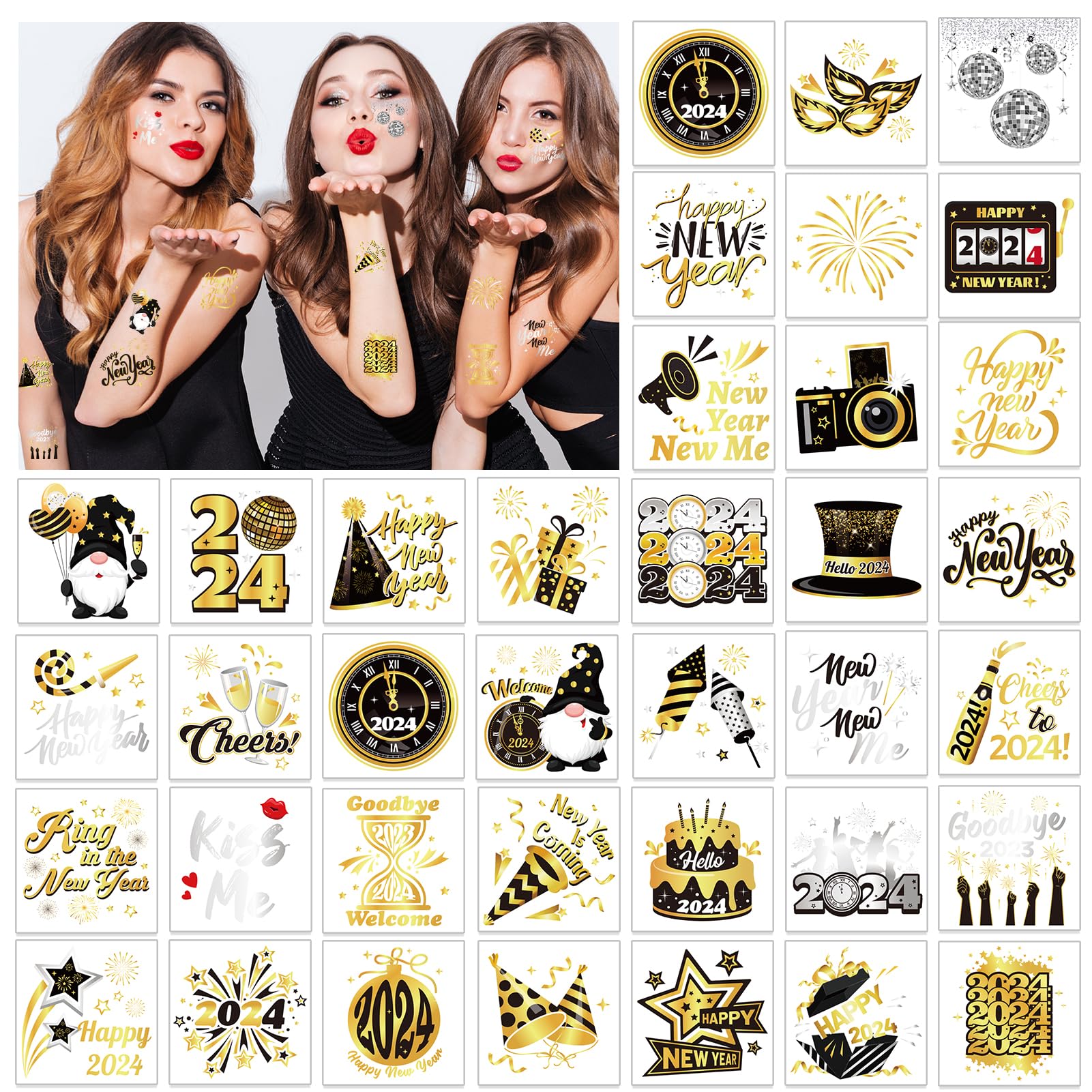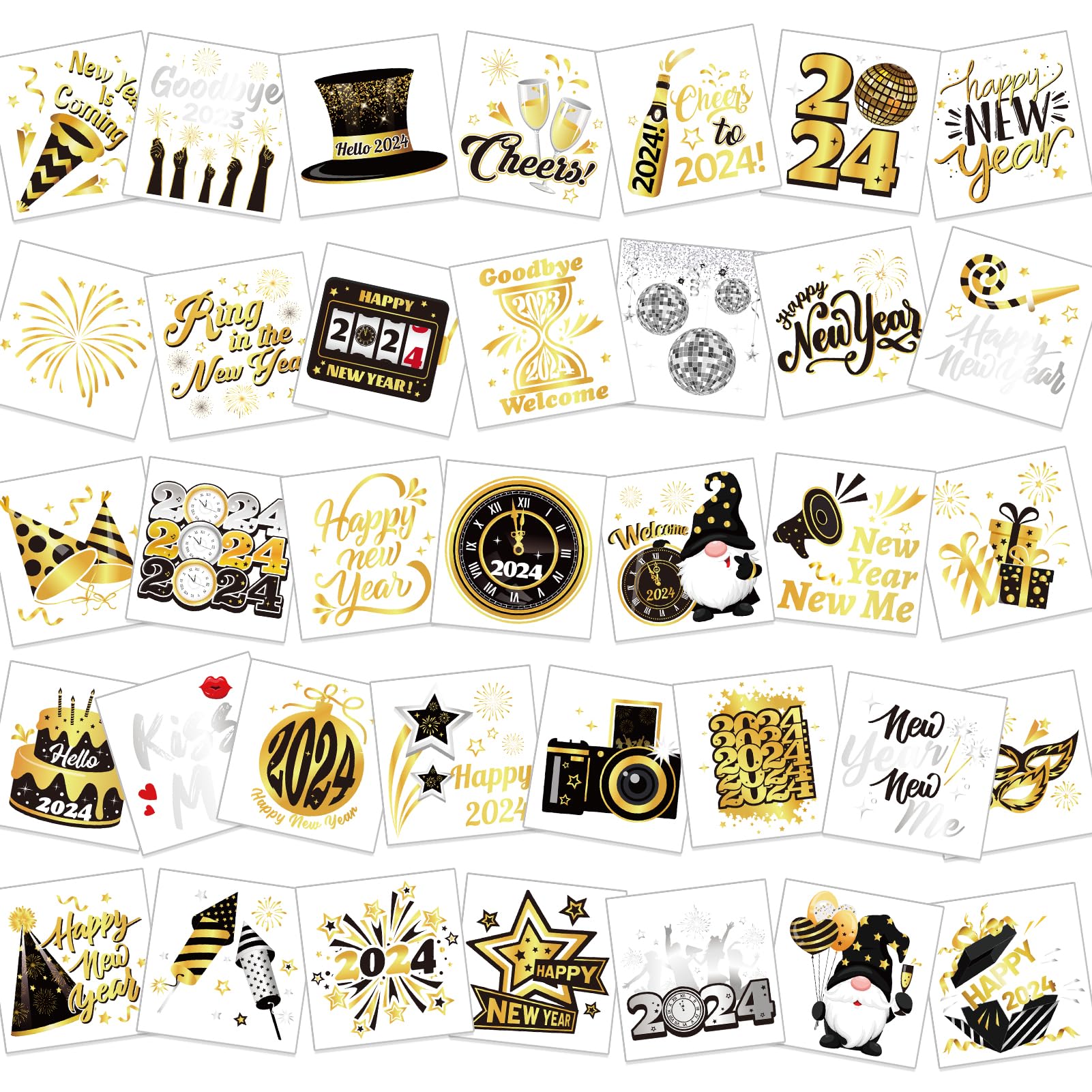 HOWAF 72pcs New Years Temporary Tattoos, 2024 NYE Party Favors Tattoos Stickers,New Year Face Tattoos for Happy New Year Eve Party Decorations,New Years Firework Temporary Tattoos, Black Gold Silver