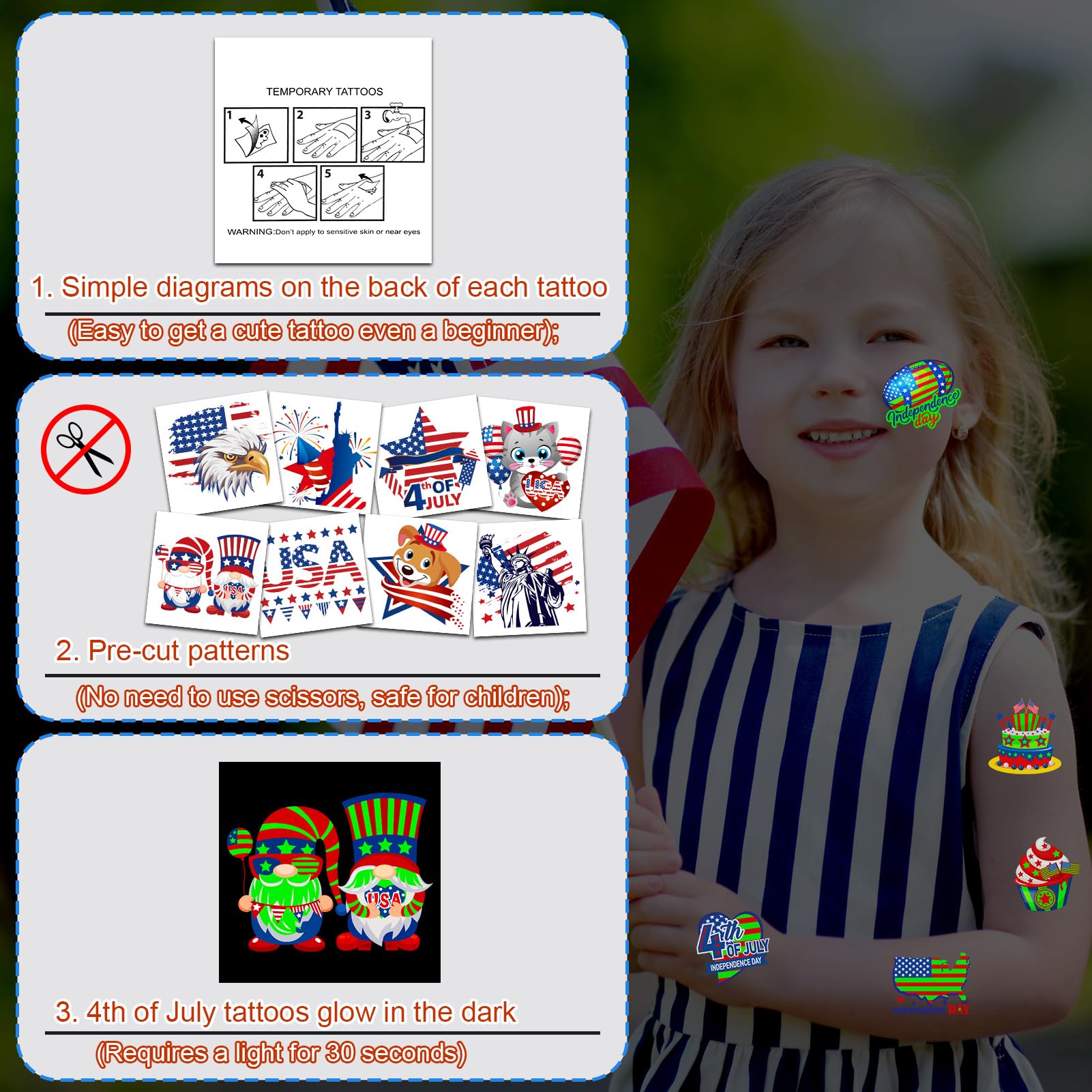 HOWAF 96pcs Glow in The Dark 4th of July Temporary Tattoos for Independence Day USA Patriotic Party Decorations, American Themed Luminous Face Tattoos for July 4th Party Favors Goodie Bag Fillers