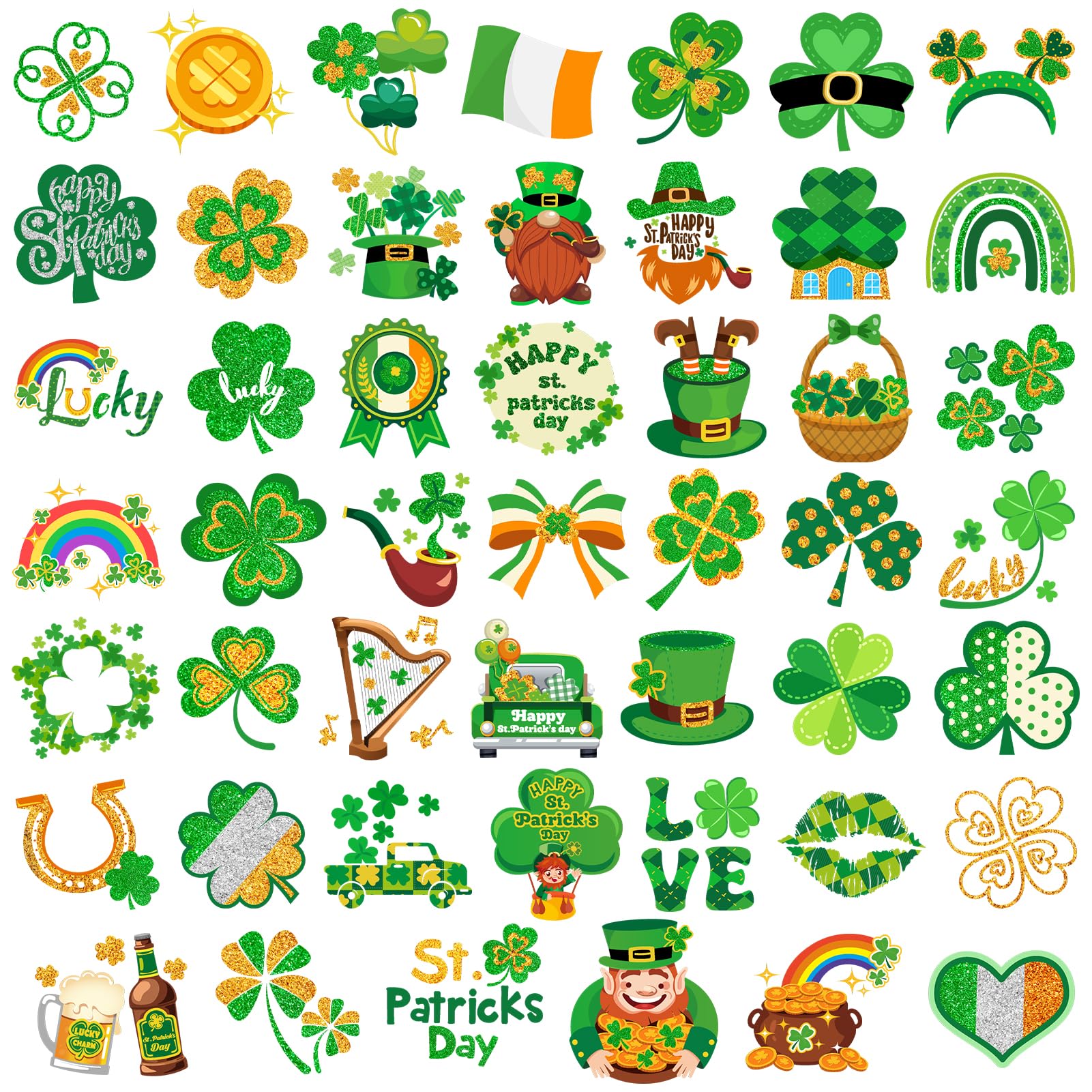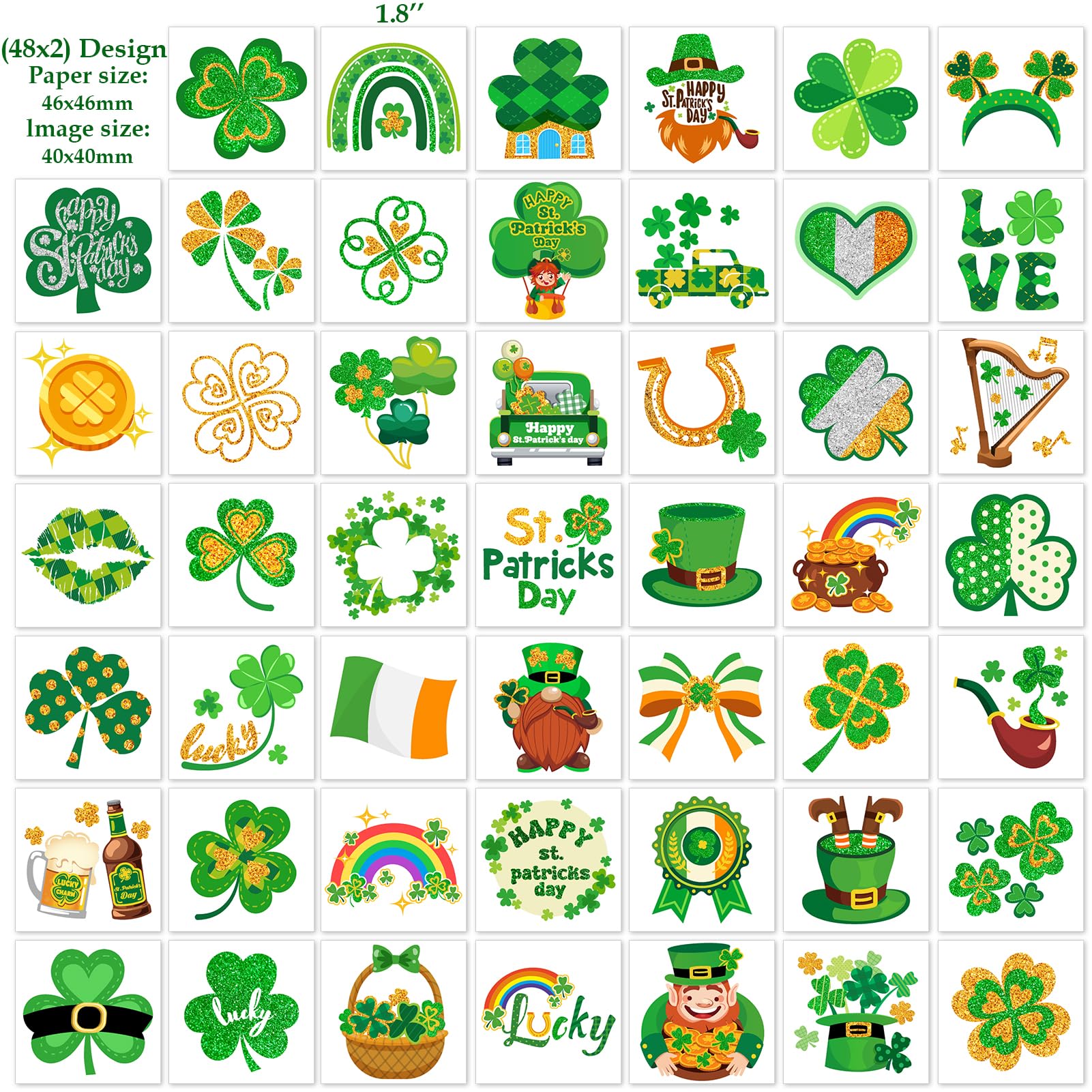 HOWAF 96pcs St. Patrick's Day Temporary Tattoos,Glitter Shamrock Tattoo Stickers for Irish Party Decorations,Lucky Clover Face Tattoos with Leprechaun for Green Party Parade Makeup
