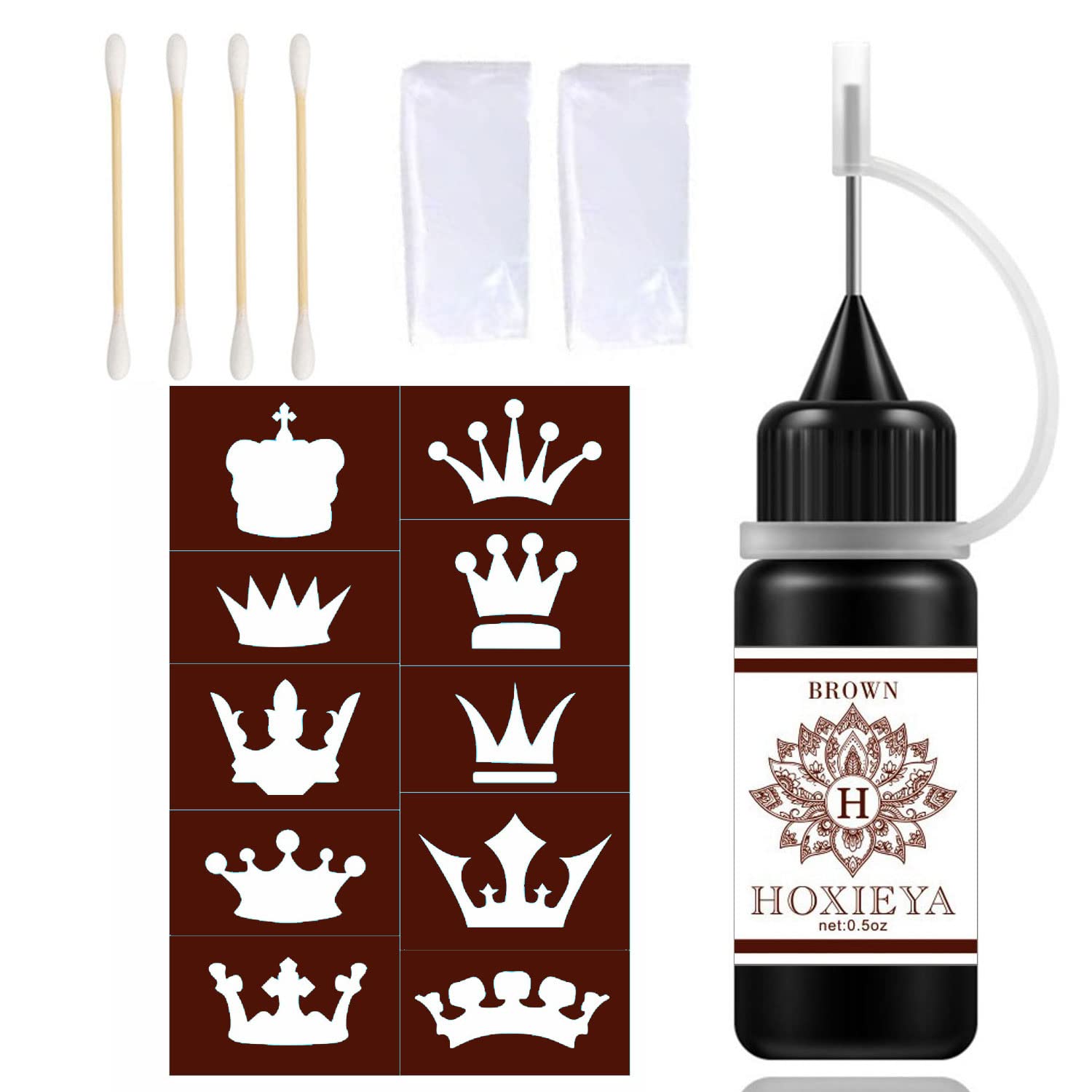 Specification:Quantity: A bottlePattern: Fake tattoos kitColor:Black, brown, green, blue,Capacity: 15ml/0.5oz each bottlePackage Contents:Black tattoo ink x1pcsTattoo stencil x50pcsDisposable gloves x2pcsPainting cotton swab x4pcsUse Instruction x1pcsFeature:?Multiple color? Four colors for your choice, black, brown, blue, green.?Easy to use?Freehand Bottled which is easier and more convenient to draw delicate patterns.?Waterproof?It is waterproof and it can last 3-5 days. Depend on how many times it touches the water.